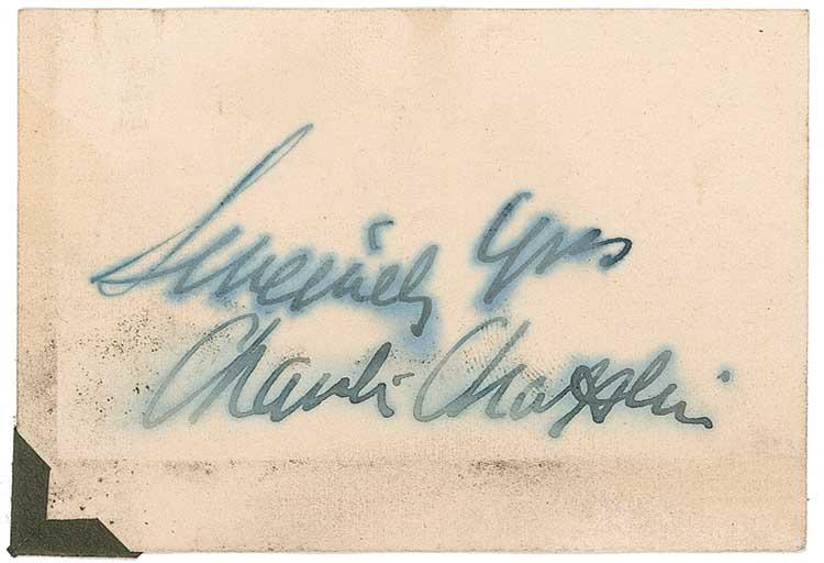 Vintage ink signature, “Sincerely yours, Charlie Chaplin,” on an off-white 3.25 x 2.25 card. In very good condition, with light overall running and spreading of ink from moisture exposure, some light soiling over signature, and toning and mounting remnant to lower left. Pre-certified PSA/DNA and RRAuction COA.