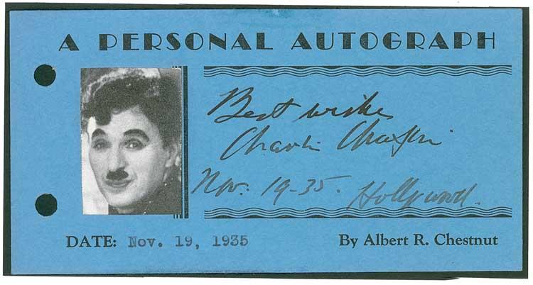 Vintage fountain pen signature, “Best wishes, Charlie Chaplin, Nov 19-35, Hollywood,” on a 5.5 x 2.75 blue card from the Albert R. Chestnut collection, also dated in type. In fine condition, attached to a slightly larger black card, with a small photo attached to the left blank area. From his Pennsylvania home, Chestnut, a printer by profession, began collecting autographs in 1935. He sent these personally-printed cards to over a thousand celebrities and received favorable replies from the vast majority, finally retiring from collecting to raise his family when postage increased from 2¢ per card! Pre-certified PSA/DNA and RRAuction COA.