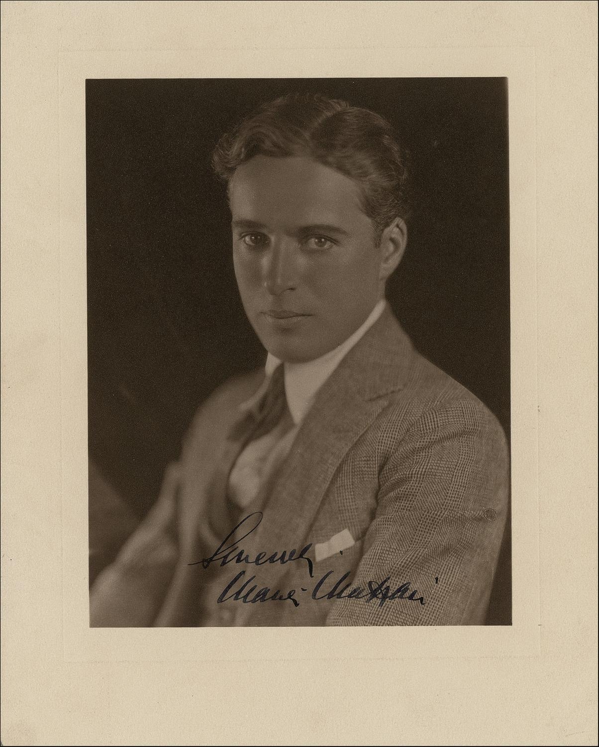 Handsome vintage matte-finish 8 x 10 photo, boldly signed in fountain pen, “Sincerely, Charlie Chaplin.” In fine condition, with a couple trivial edge dings. A fine image of one of the seminal geniuses in the history of film!