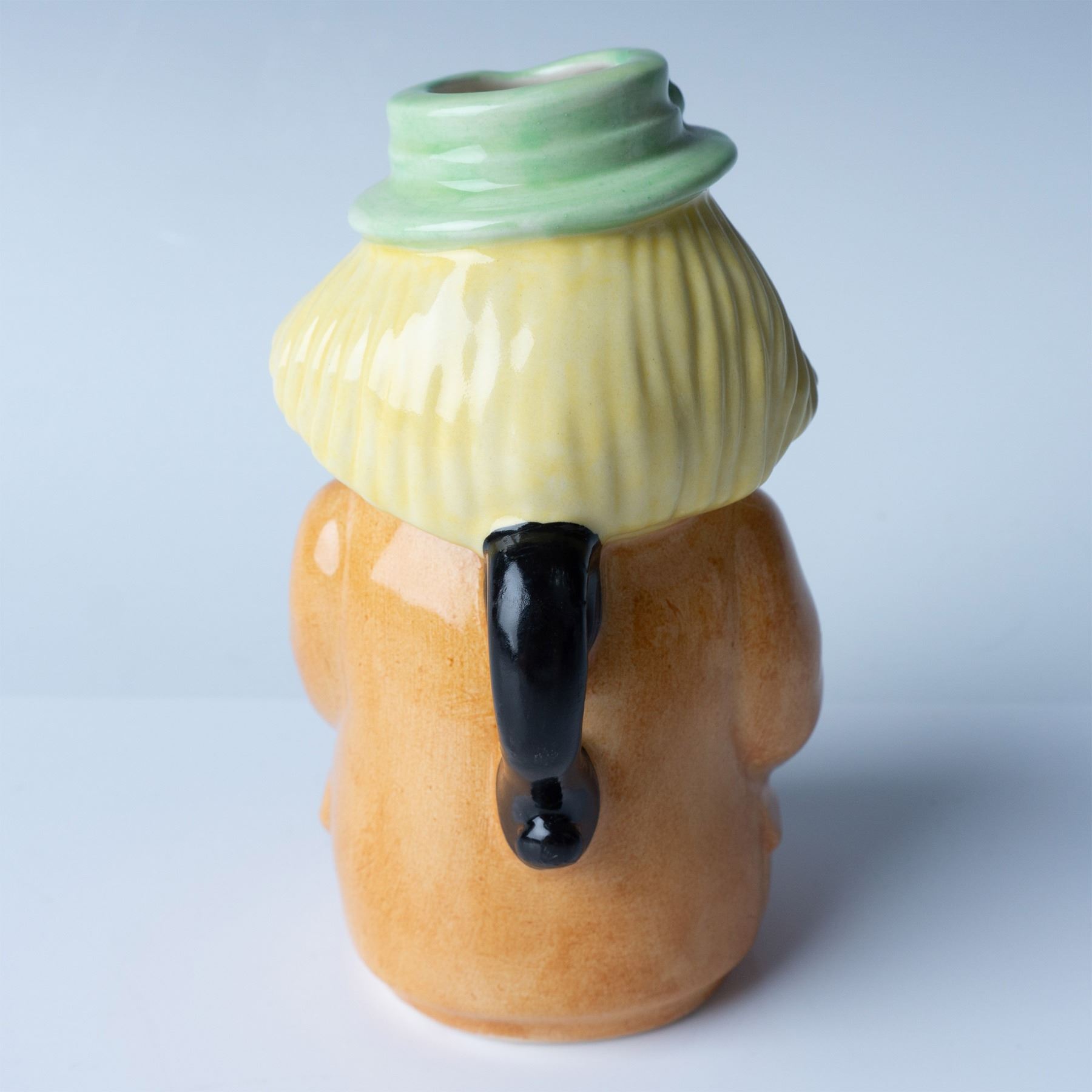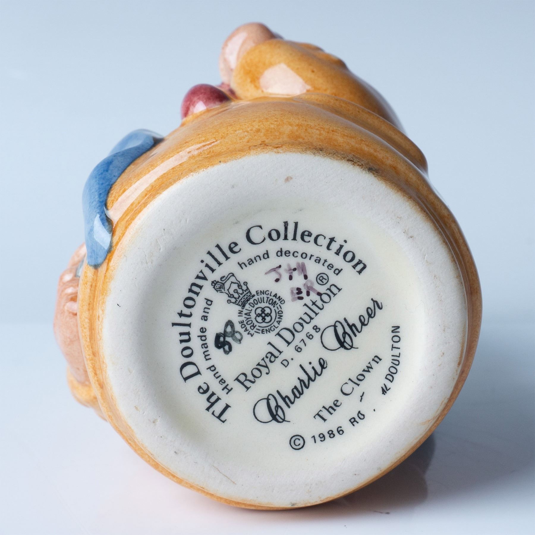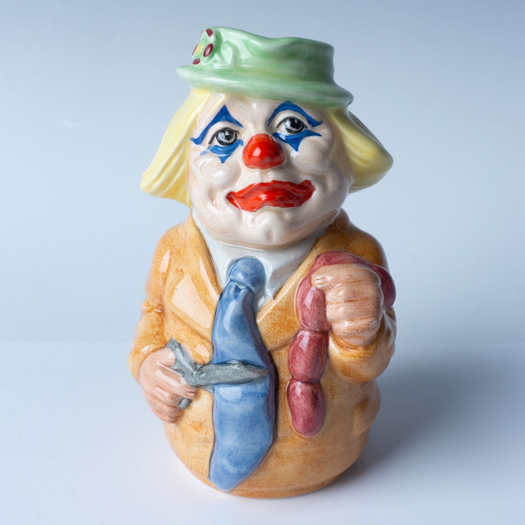 Royal Doulton Toby Jug, Charlie Cheer the Clown D6768 (orange jacket; blue tie; green cap; yellow hair; pink sausages). This piece is a wonderful addition to any Royal Doulton collection. Royal Doulton backstamp. D6768.