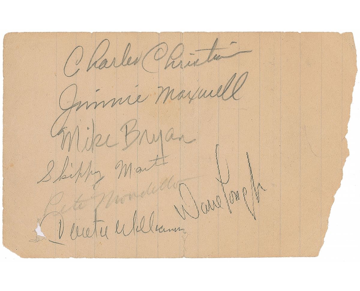 Swing and jazz guitarist (1916–1942) and member of the Benny Goodman Orchestra. Vintage pencil signature, “Charlie Christian,” on an off-white 5.25 x 3.5 lightly-lined sheet, also signed by Dave Tough, Jimmie Maxwell, Mike Bryan, Skippy Martin, Pete Mondello, and Cootie Williams. Small separations to the central vertical fold, a uniform shade of light toning, and a small hole to lower left, otherwise fine condition.