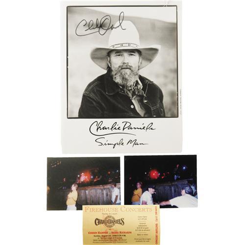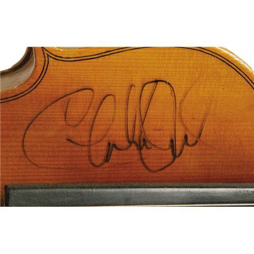 <B>Charlie Daniels Signed Fiddle and Photo.</B></I> A handsome fiddle signed by the country legend in black marker, along with two color snapshots of Daniels playing the fiddle, an autographed b&w 8" x 10" photo signed by him in black marker, and a pair of unused tickets for a 1998 performance. Fiddles have been forever linked to Daniels, thanks tot he popularity of his sizzling hit single "The Devil Went Down to Georgia." In Overall Very Fine condition with mild wear to the fiddle.<I>Accompanied by LOA from PSA/DNA.</B></I><BR><BR><b>Shipping:</b> Musical Instruments, Small (<a target="_blank" href="http://www.heritageauctions.com/common/shipping.php">view shipping information</a>)