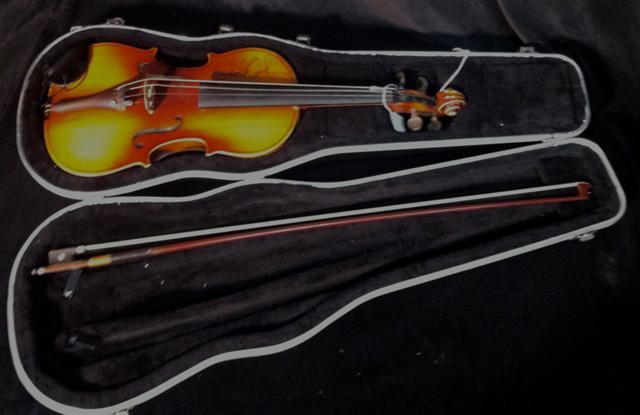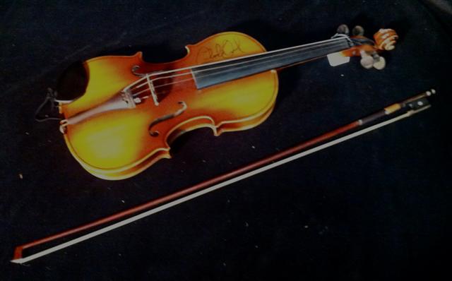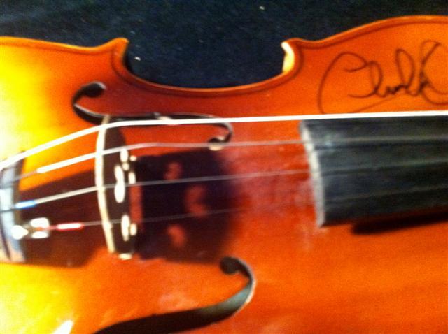 Charlie Daniels Stage Played Autographed Violin - A Suzuki violin and bow played by Charlie Daniels at a benefit for the Fingerlakes Race Track and Casino in Farmington, NY. Daniels performed at the benefit and then signed the violin. Violin shows signs of play as well as resin deposits. Includes a framed photograph of him holding the signed violin at the benefit, carrying case. and original documentation. 31" x 11" x 5". Oversized item. Additional shipping charges required.