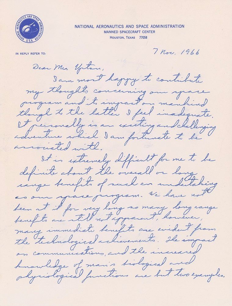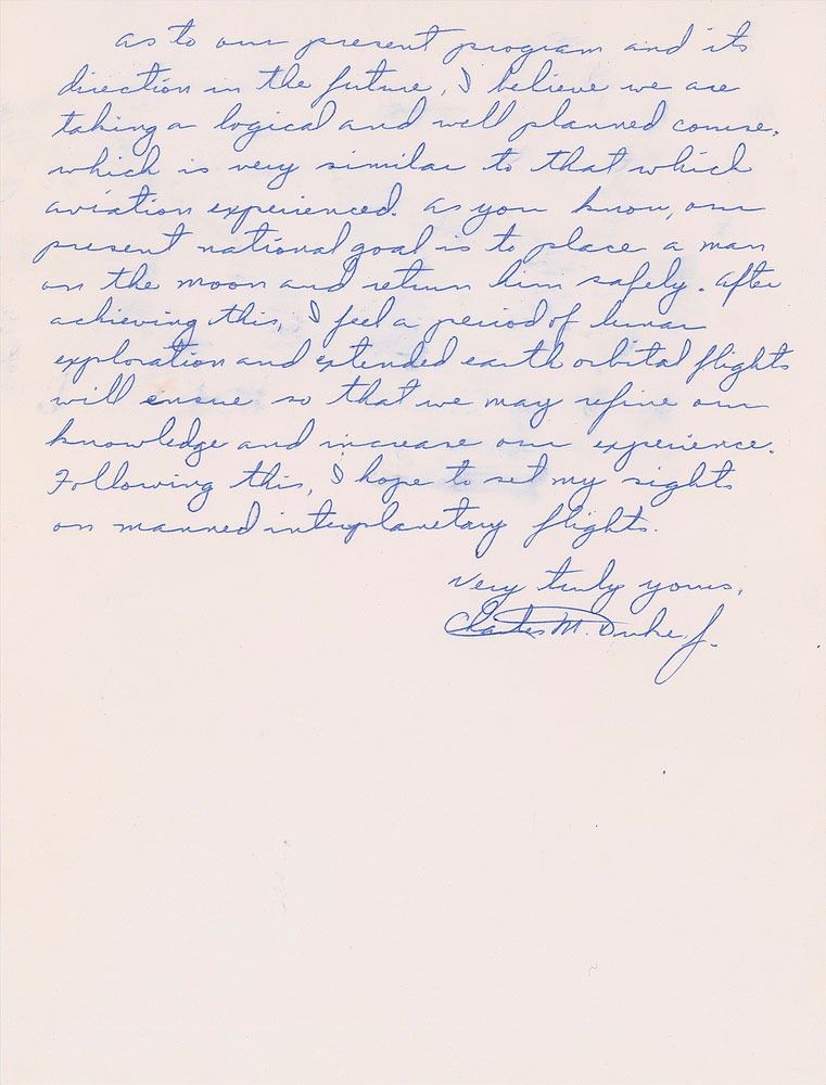 ALS signed “Charles M. Duke, Jr.,” two pages, 8 x 10.5, NASA letterhead, November 7, 1966. Letter to J. Duane Upton, in full: "I am most happy to contribute my thoughts concerning our space program and its impact on mankind though to the latter I feel inadequate. It personally is an exciting and challenging adventure which I am fortunate to be associated with. It is extremely difficult for me to be definite about the overall or long range benefits of such an undertaking as our space program. We have not been at it for very long so many long range benefits are still not apparent, however, many immediate benefits are evident from the technological achievements. The impact on communications, and the increased knowledge of man's biological and physiological functions are two examples. As to our present program and its direction in the future, I believe we are taking a logical and well planned course, which is very similar to that which aviation experienced. As you know, our present national goal is to place a man on the moon and return him safely. After achieving this, I feel a period of human exploration and extended earth orbital flights will ensue so that we may refine our knowledge and increase our experience. Following this, I hope to set my sights on manned interplanetary flight." In fine condition, with a bit of subtle brushing to ink. Duke would go on to become the tenth person to set foot on the moon as Lunar Module Pilot of Apollo 16. A thoughtful letter from the future moonwalker on the potential of the American space program.