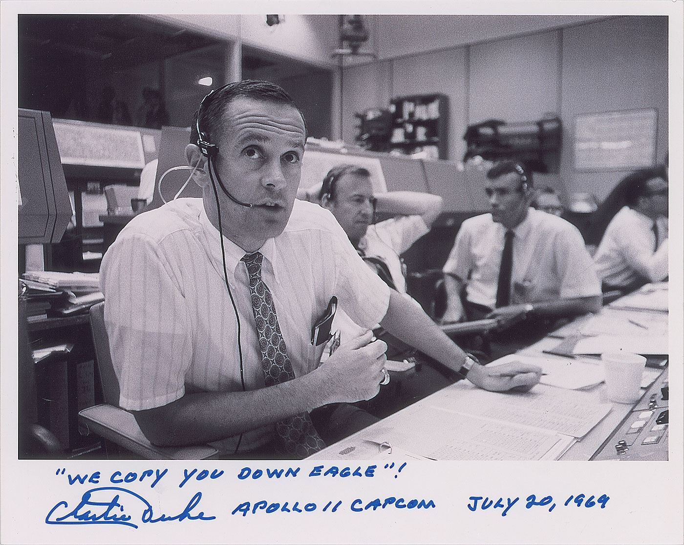 Satin-finish 10 x 8 photo of Duke talking on his headset in the mission control center, with James Lovell and Fred Haise in the background, signed in the lower border in blue felt tip, “‘We copy you down eagle’! Charlie Duke, Apollo 11 CAPCOM, July 20, 1969.” In very fine condition.