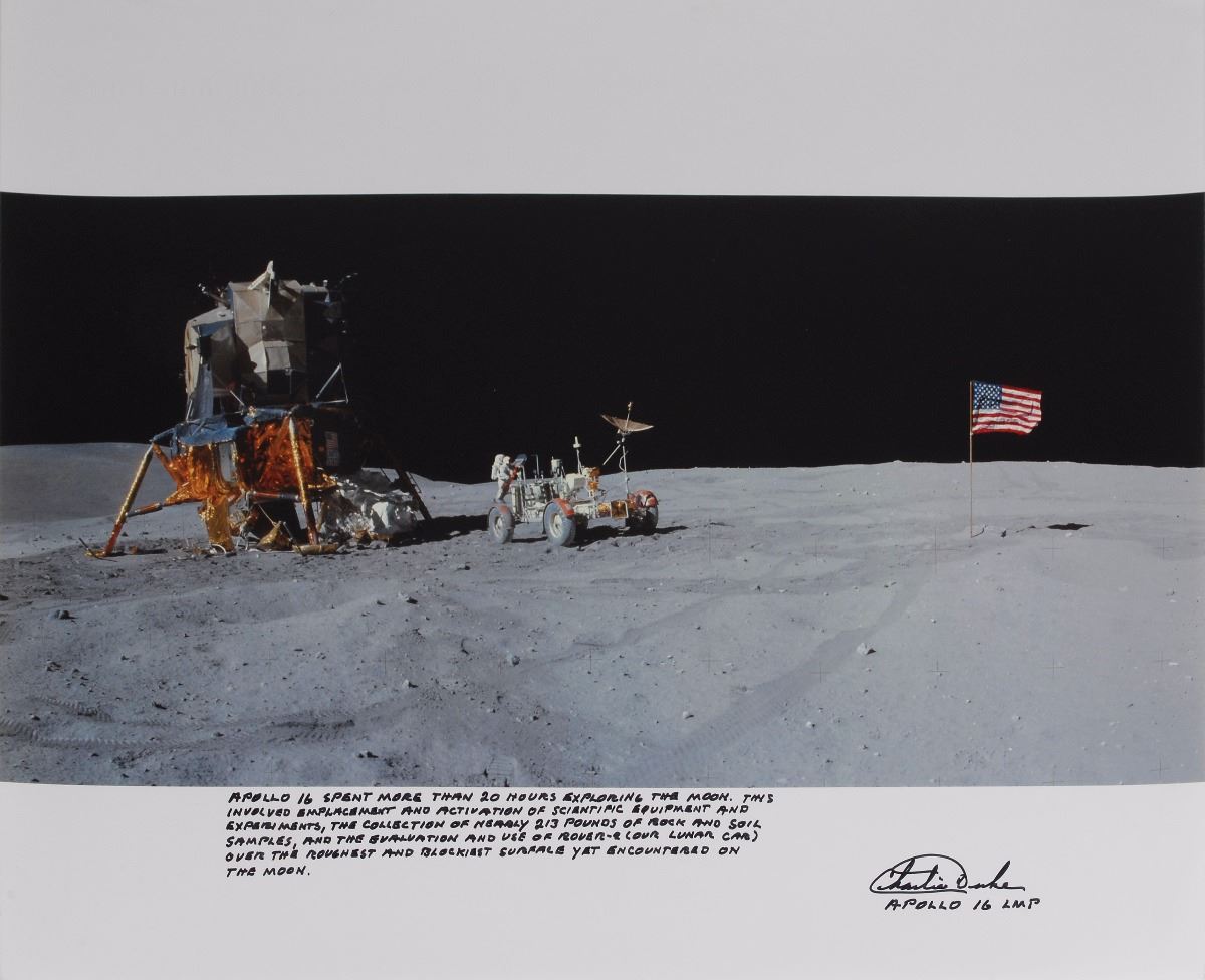 Color satin-finish 20 x 16 panoramic photo of the Apollo 16 lunar module and rover on the moon’s surface, with the American flag to the far right, signed in the lower border in black felt tip, “Charlie Duke, Apollo 16 LMP,” who adds, “Apollo 16 spent more than 20 hours exploring the moon. This involved emplacement and activation of scientific equipment and experiments, the collection of nearly 213 pounds of rock and soil samples, and the evaluation and use of rover–2 (our lunar car) over the roughest and blockiest surface yet encountered on the moon.” In fine condition. An immersing, wide-frame portrayal of the lunar surface, further enhanced by Duke’s wonderfully detailed inscription.