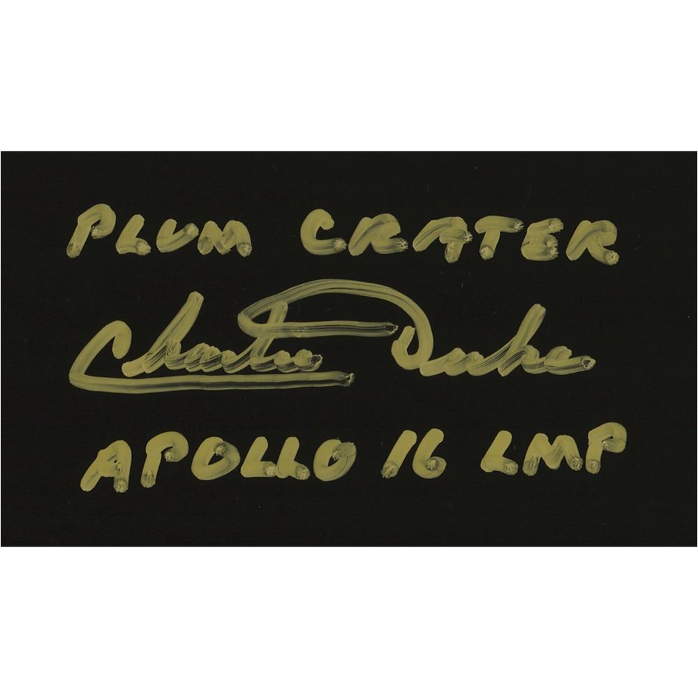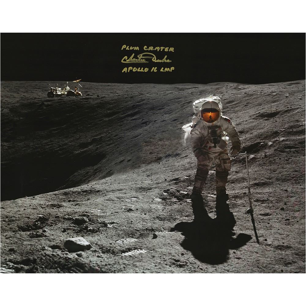 Color glossy 20 x 16 full-length photo of Lunar Module Pilot Charlie Duke collecting lunar soil samples during a mission EVA, the lunar rover vehicle visible on the opposite rim of a large moon crater, signed in gold ink, “Plum Crater, Charlie Duke, Apollo 16 LMP.†In fine condition.