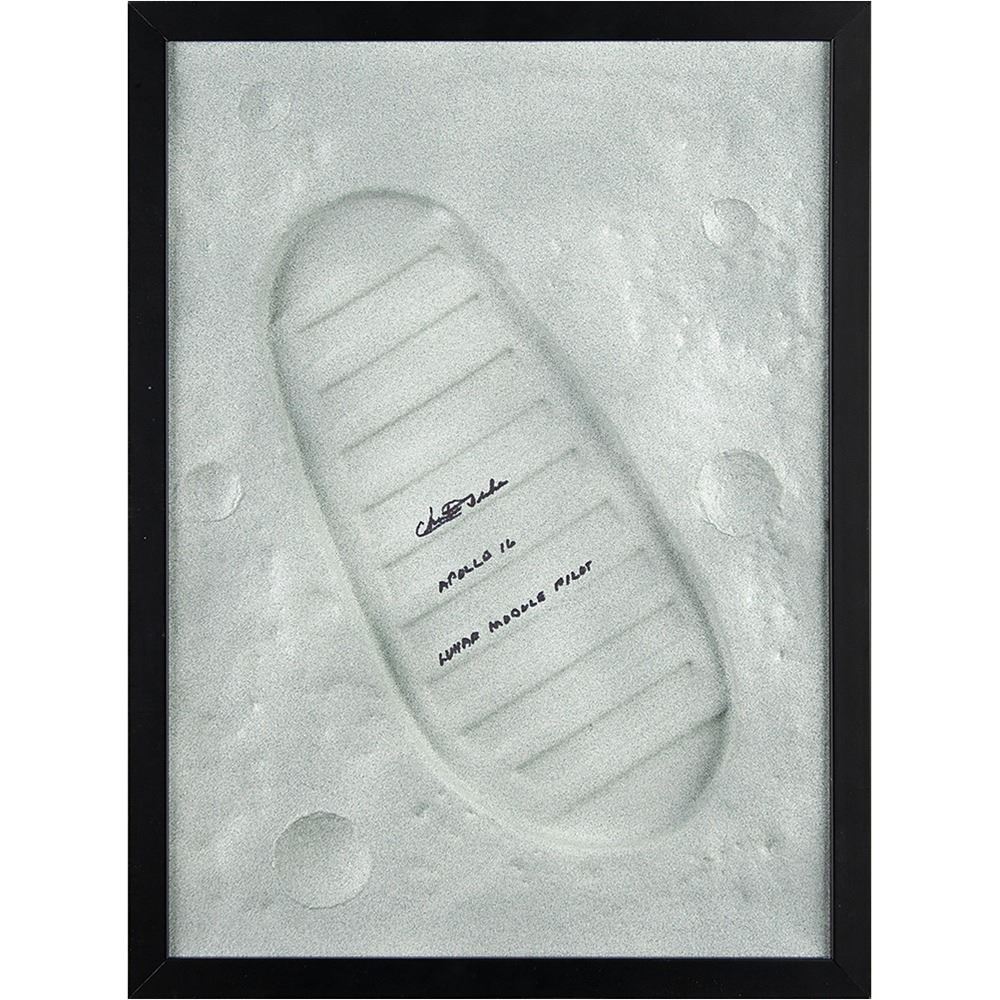 Appealing three-dimensional lunar bootprint display plaque featuring a cast taken from an actual Apollo lunar boot, 14.25 x 19.25, signed in the bootprint in black felt tip, "Charlie Duke, Apollo 16, Lunar Module Pilot." Framed and in fine condition.
