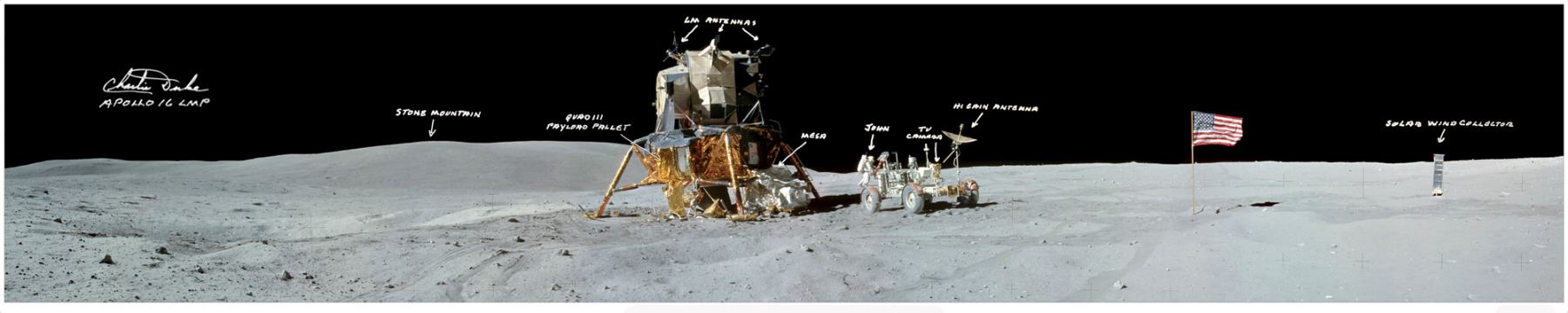 Stunning 40'' x 8'' panoramic photo of the Apollo 16 landing site, signed by astronaut Charlie Duke, who adds handwritten notations to the photo. Signed in silver ink on the black sky, ''Charlie Duke / Apollo 16 LMP [Lunar Module Pilot]'', Duke also identifies objects in the photo such as ''Stone Mountain'' in the background, and his fellow astronaut ''John'' Young. Print along bottom margin of photo reads ''Apollo 16 Landing Site, showing the lunar module, 'Orion' and the lunar rover. In the background is Stone mountain''. Photo measures 40'' x 8''. Near fine condition.