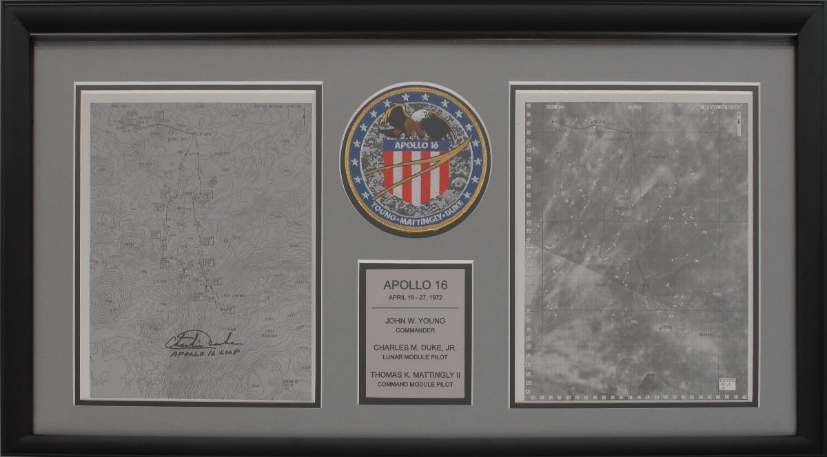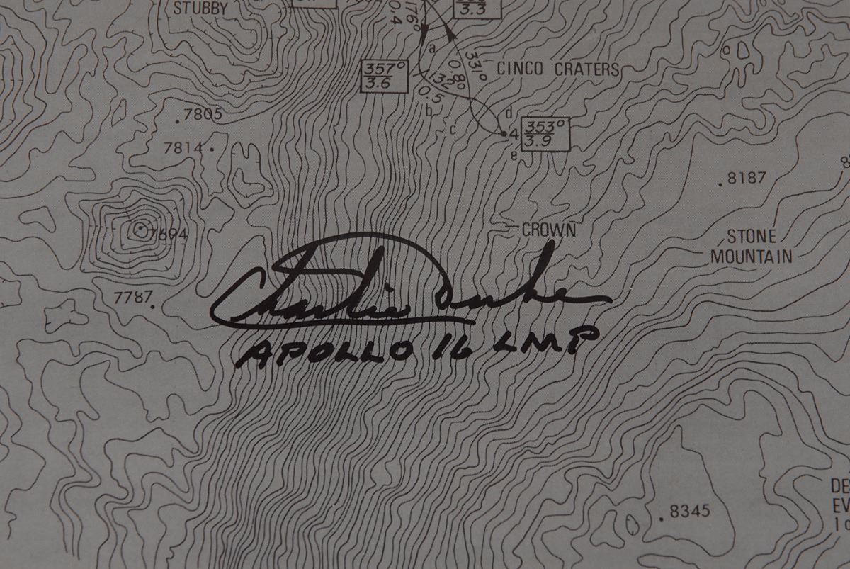 Uncommon 8.25 x 10.75 EVA chart for the Apollo 16 mission, displaying the lunar module landing site with various points of interest and topographic contour lines, signed in black felt tip, “Charlie Duke, Apollo 16 LMP.” Double-matted and framed with an adjacent gridded EVA chart, a large gold-trimmed Apollo 16 patch, and a mission specific nameplate to an overall size of 29.5 x 16. In fine condition. Originating from the Astronaut Scholarship Foundation, a portion of the proceeds for the sale of this item will be donated to the ASF.