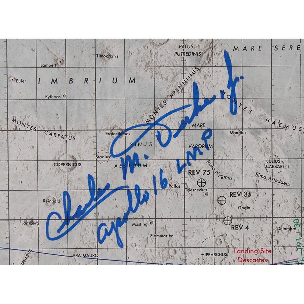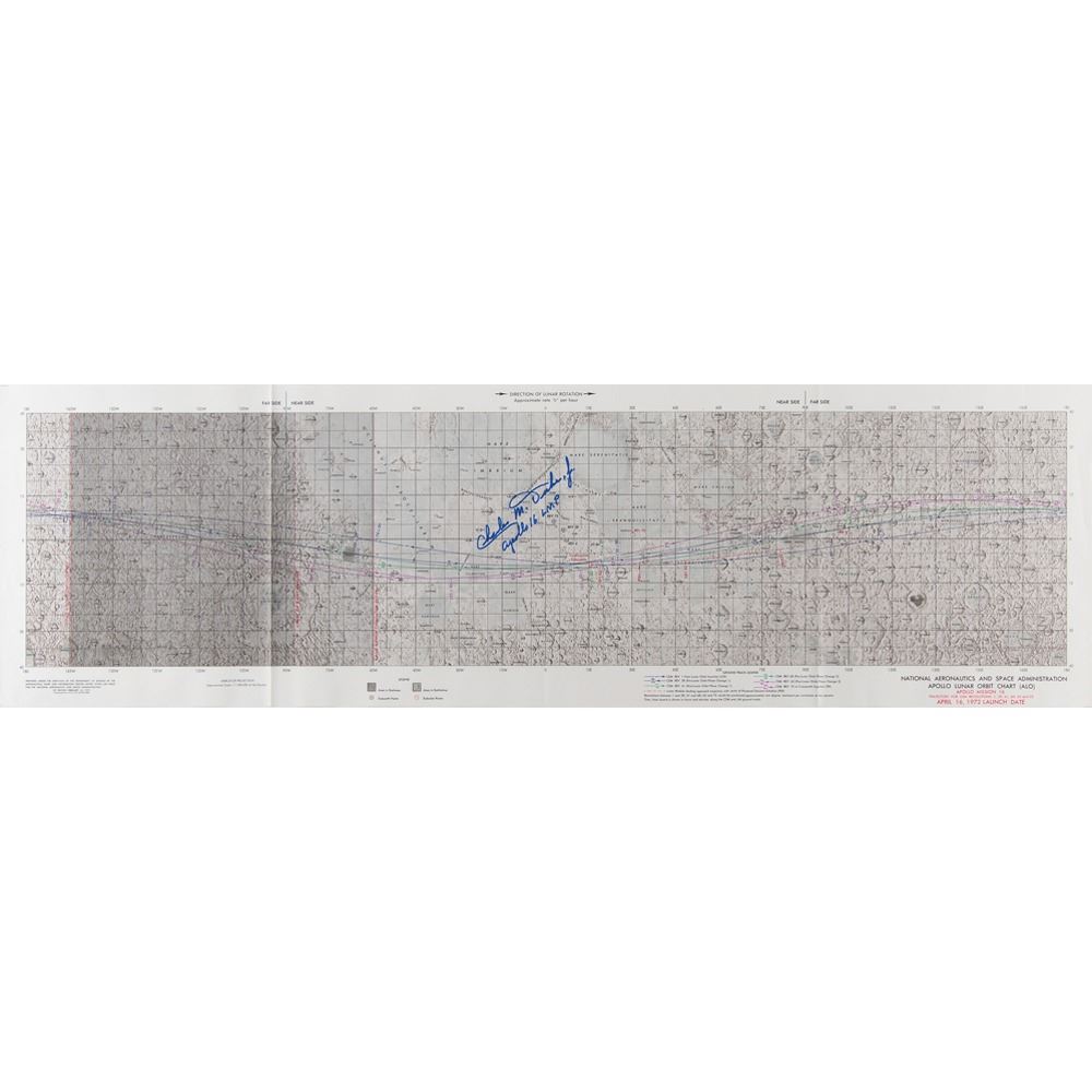 First edition Apollo Lunar Orbit Chart (ALO) for Apollo 16, 41 x 12, signed at center in blue felt tip, "Charles M. Duke, Jr., Apollo 16 LMP." Labeled in the lower right corner, "Trajectory for CSM Revolutions 1, 39, 41, 60, 62 and 75, April 16, 1972 Launch Date," this chart displays the harsh lunar terrain and tracking lines for several Apollo 16 lunar orbits, passing over the Oceanus Procellarum, Mare Tranquillitatis, Mare Serenitatis, and other regions. Folded and in fine condition.