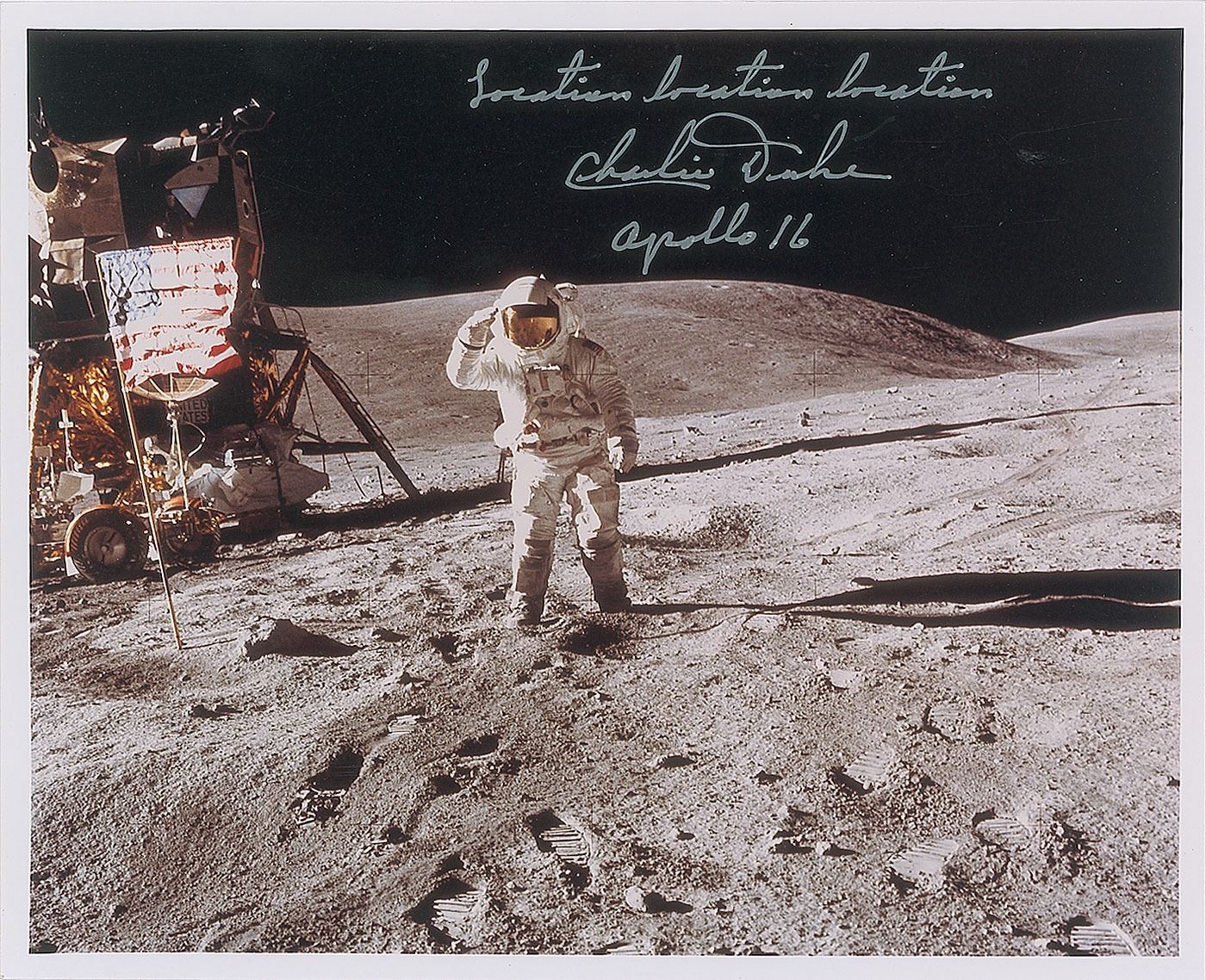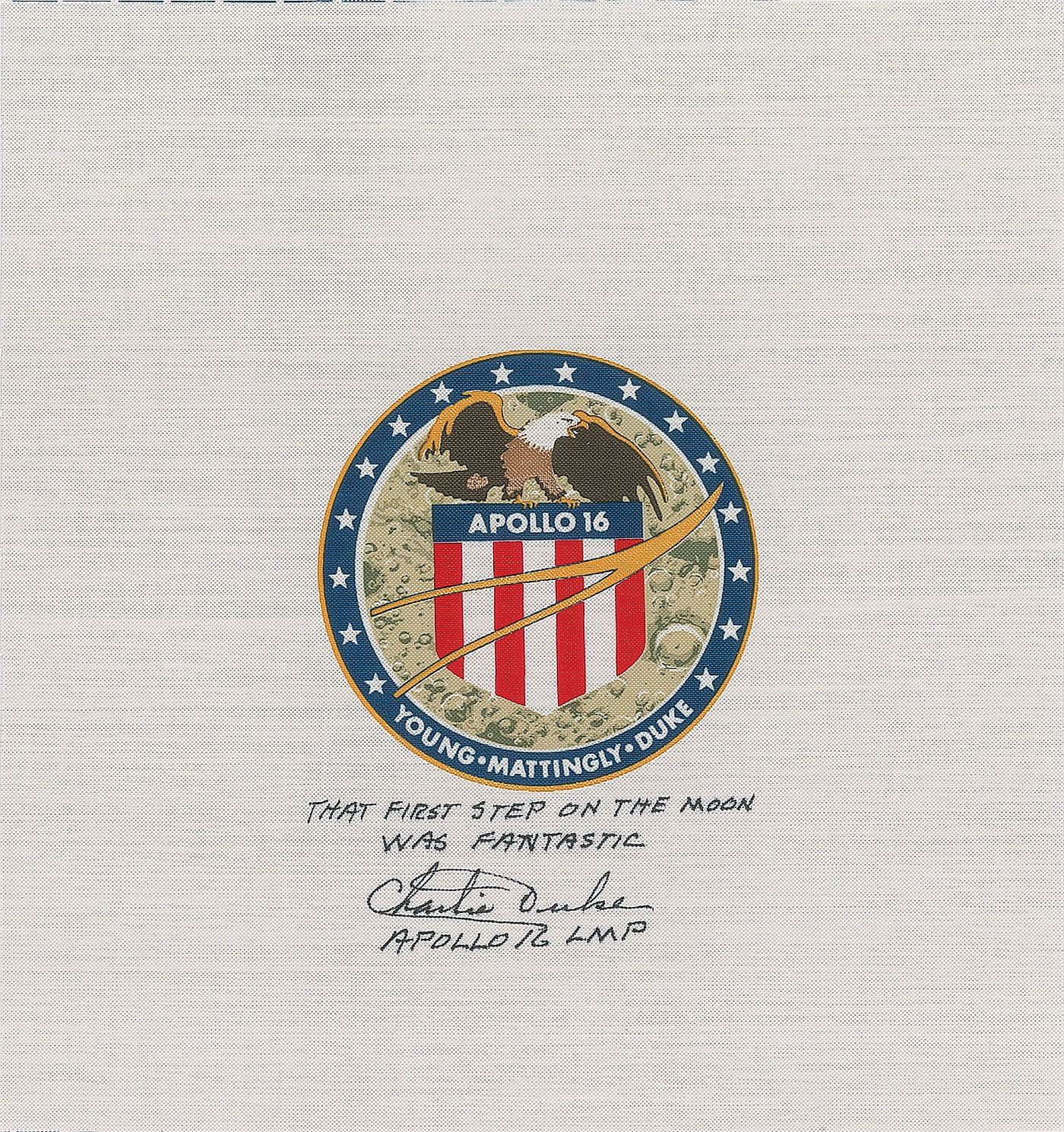 Two items: an 8.5 x 9 swatch of Beta cloth bearing a preprinted 3.5? diameter Apollo 16 mission insignia, signed in black felt tip, "That first step on the moon was fantastic, Charlie Duke, Apollo 16 LMP"; and a color glossy 10 x 8 full-length photo of Duke saluting the American flag on the lunar surface during the Apollo 16 mission, signed in silver ink, "Location location location, Charlie Duke, Apollo 16." In overall very fine condition. Consignor notes that the Beta cloth was signed at the UACC Convention in Burbank in 2004.