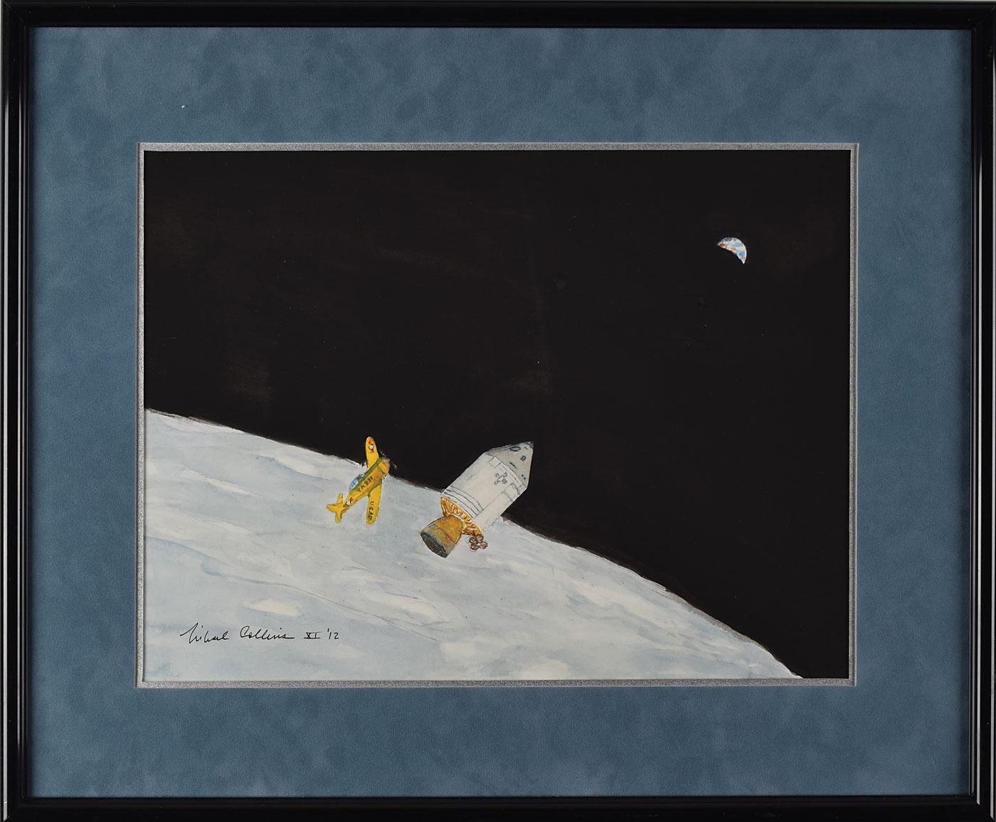 Wonderful color 20 x 20 print on stretched canvas of Charlie Duke inspecting the gorgeous Lunar Roving Vehicle during the Apollo 16 mission, signed in silver ink, "Returning my camera to the storage area under my seat! Charlie Duke, Apollo 16 LMP." In fine condition.