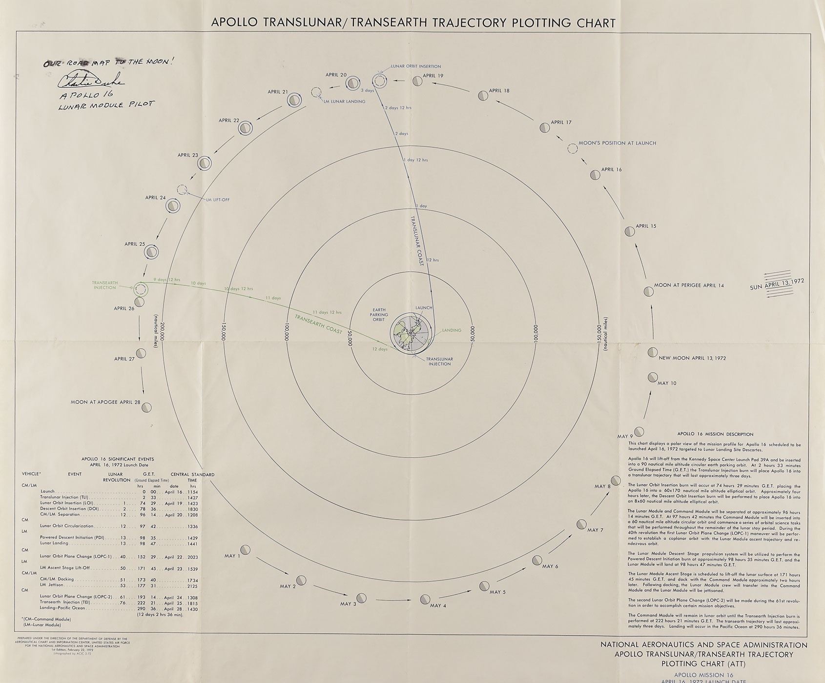 Color first edition of the Apollo 16 Translunar/Transearth Trajectory Plotting Chart (ATT), 24 x 20, dated February 22, 1972, signed in the upper left corner in black ink, "Our road map to the moon! Charlie Duke, Apollo 16, Lunar Module Pilot." The chart displays a polar view of the lunar mission profile for Apollo 16, showing the various significant events during the 11-day mission. Lithographed by ACIC 3-72, and prepared under the direction of the Department of Defense by the Aeronautical Chart and Information Center. In fine condition, with intersecting folds, and some smudging to the handwriting.