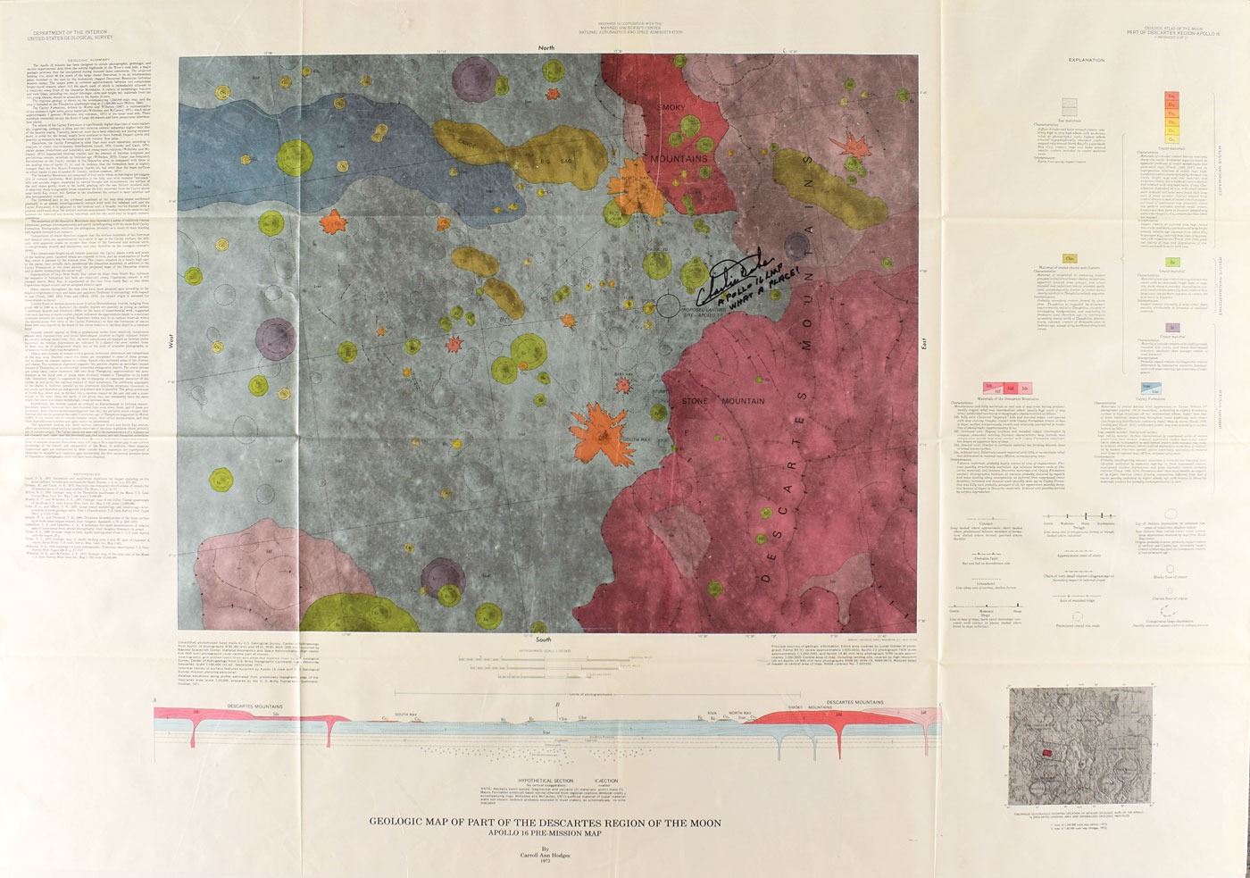Pair of color Apollo 16 pre-mission geological maps of the Descartes region of the moon by Daniel J. Milton and Carroll Ann Hodges, published by the US Geological Survey in 1972. The first map, 44 x 30.25, scale 1:50,000, shows the geology of the Descartes with proposed landing site, and is signed in black felt tip with a typically exuberant Duke quote spoken on the moon, “Charlie Duke, Apollo 16 LMP, What a place!” The second map, 37.75 x 21.5, scale 1: 250,000, displays the regional geologic setting of the Apollo 16 mission and classifies material as either pre-Imbrian, Imbrian System, Eratosthenian System, or Copernican System. Includes the original Department of the Interior, United States Geological Survey (Map I-748) storage folder. In fine, folded condition.