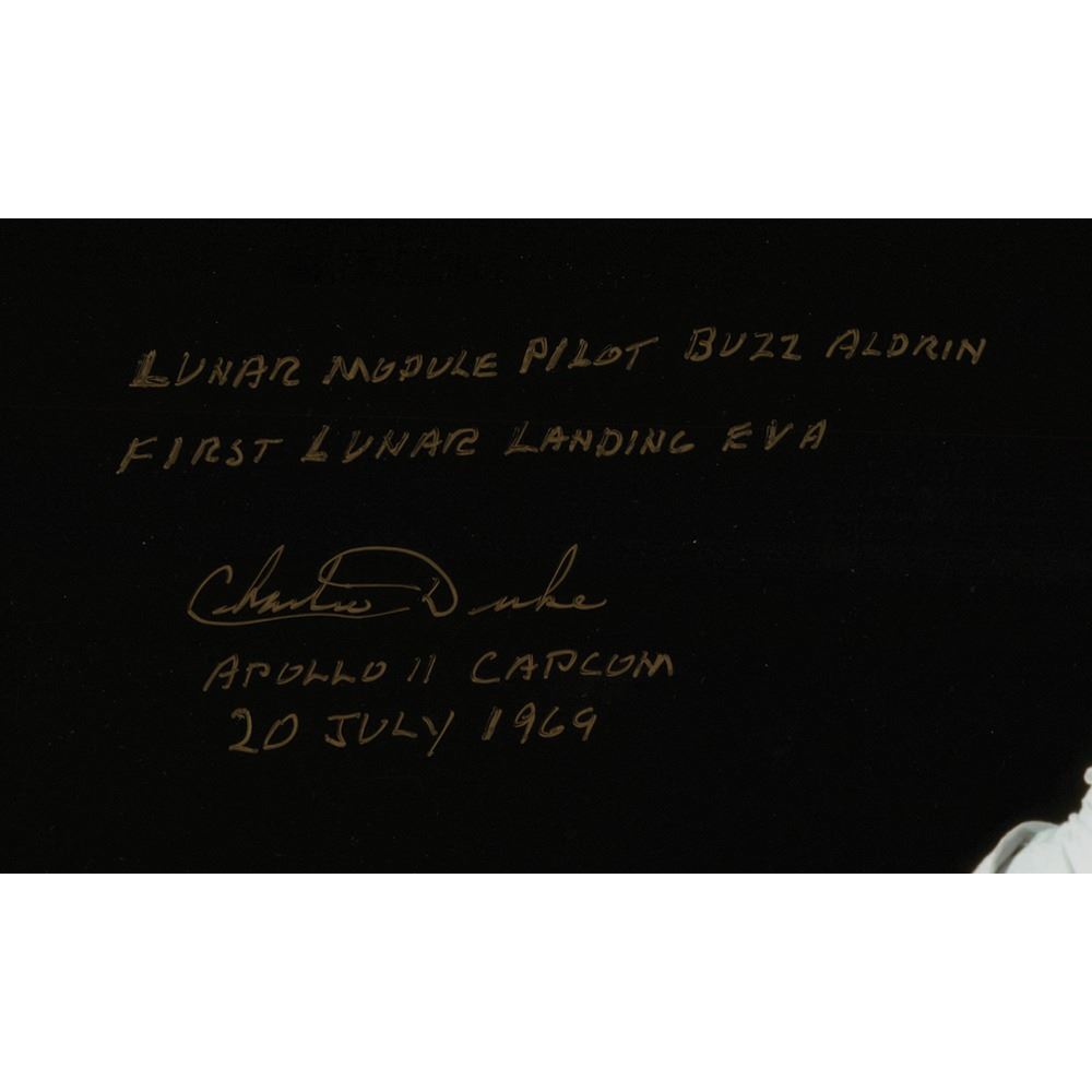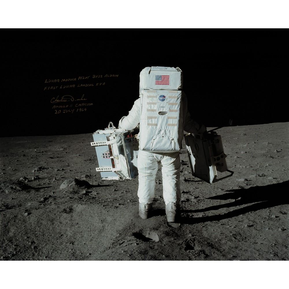 Color glossy 20 x 16 photo of LMP Buzz Aldrin carrying a laser reflector and seismometer during an Apollo 11 moonwalk, signed in gold ink, "Lunar Module Pilot Buzz Aldrin, First Lunar Landing EVA, Charlie Duke, Apollo 11 CAPCOM, 20 July 1969." In fine condition, with a small crease to the left side.