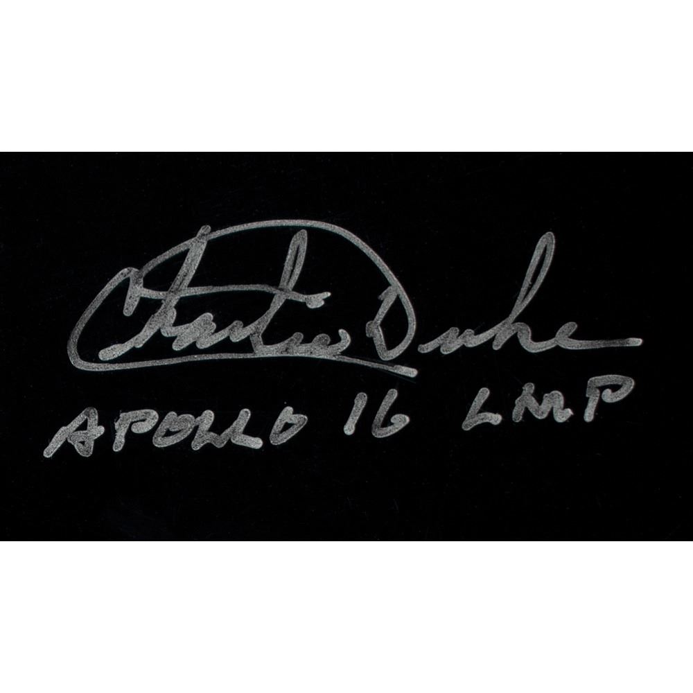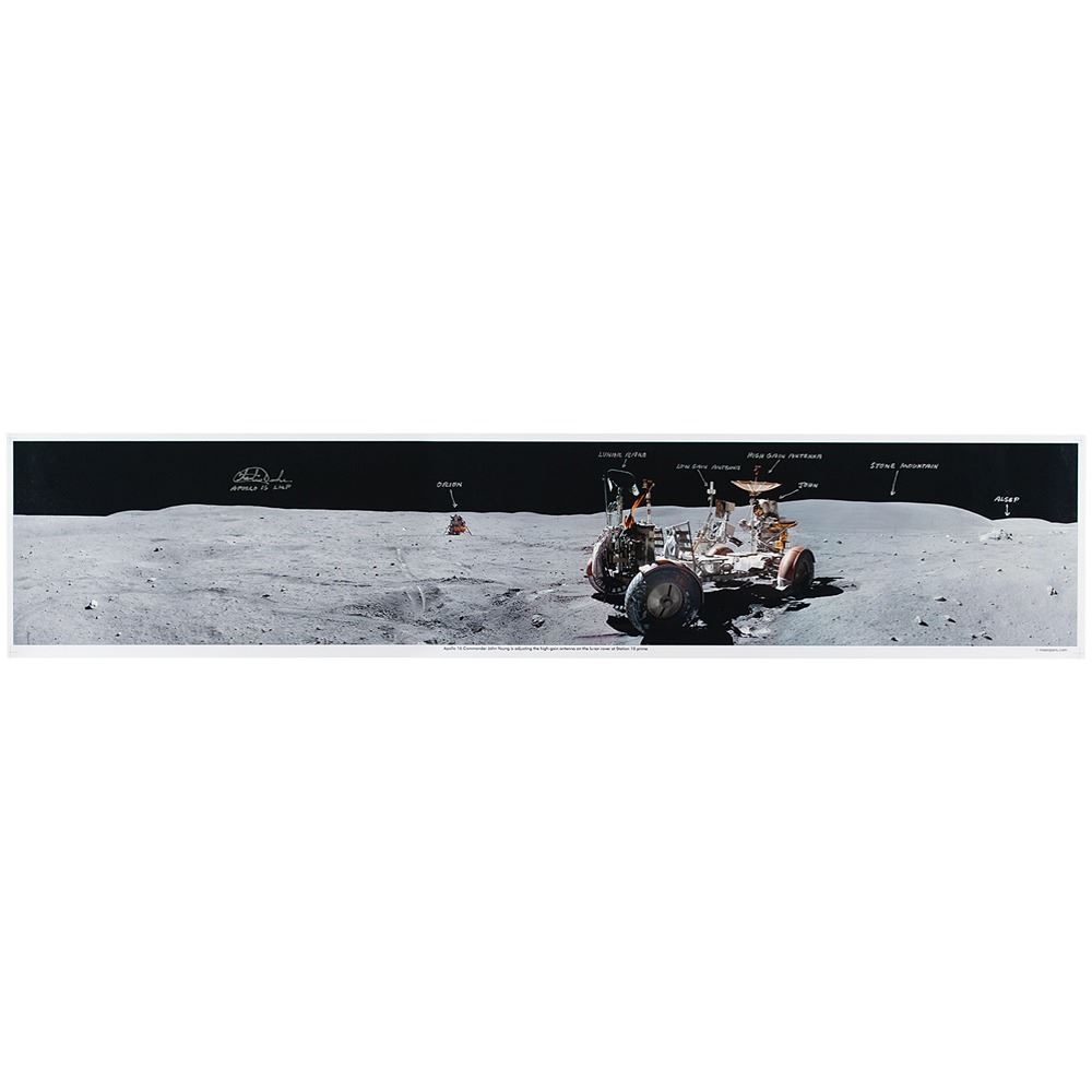 Highly displayable color satin-finish 40.25 x 8.5 panoramic photo of John Young adjusting the high-gain antenna on the lunar rover at Station 10 prime during the Apollo 16 mission, signed in silver ink, "Charlie Duke, Apollo 16 LMP," who identifies "Stone Mountain," his commander, "John," the lunar module, "Orion," and a variety of equipment, "Lunar Rake," "Low Gain Antenna," "High Gain Antenna," and "ALSEP." Rolled and in fine condition. Accompanied by a certificate of authenticity from Moonpans.