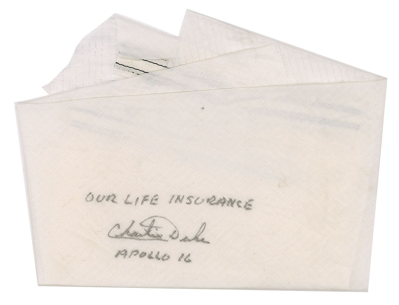 Large two-layer swatch of Apollo program parachute fabric, approximately 20 x 16.75, signed in black felt tip, "Our life insurance, Charlie Duke, Apollo 16." In fine condition.