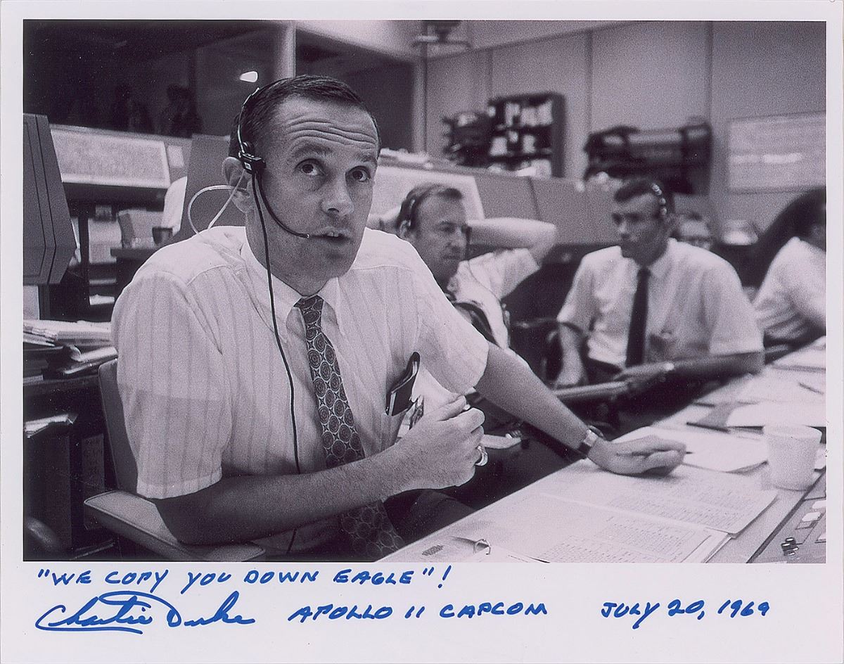 Satin-finish 10 x 8 photo of Duke talking on his headset in the mission control center, with James Lovell and Fred Haise in the background, signed in the lower border in blue felt tip, “‘We copy you down eagle’! Charlie Duke, Apollo 11 CAPCOM, July 20, 1969.” In fine condition.