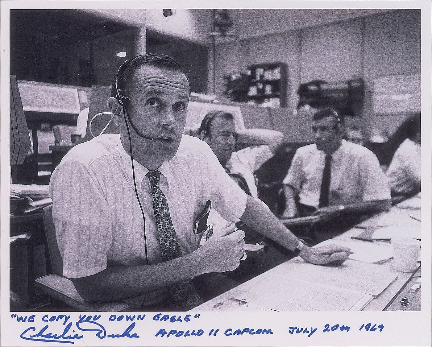 Satin-finish 10 x 8 photo of Duke talking on his headset in the mission control center, with James Lovell and Fred Haise pictured in the background, signed in the lower border in blue felt tip, “‘We copy you down eagle,’ Charlie Duke, Apollo 11 CAPCOM, July 20, 1969.” In very fine condition.