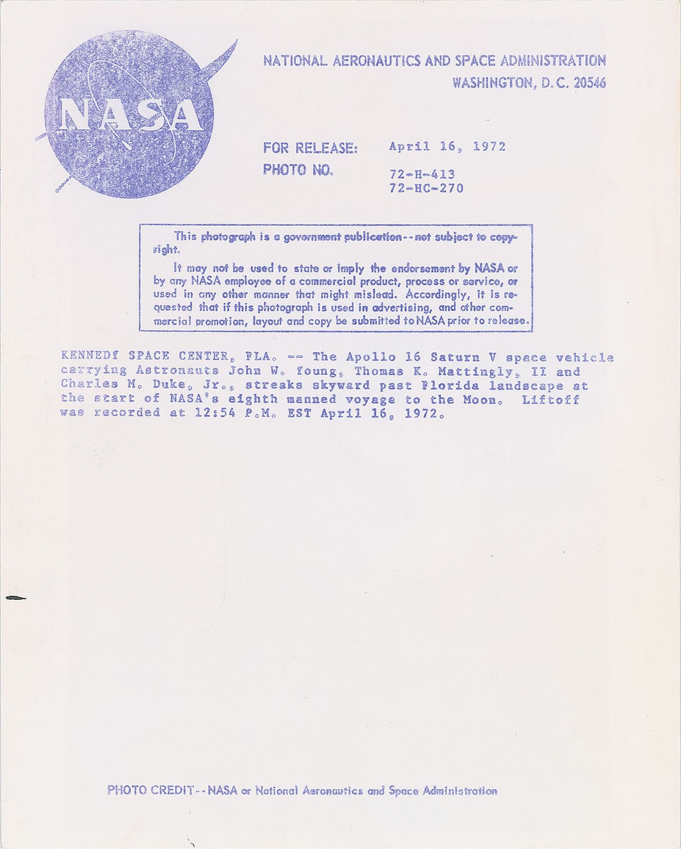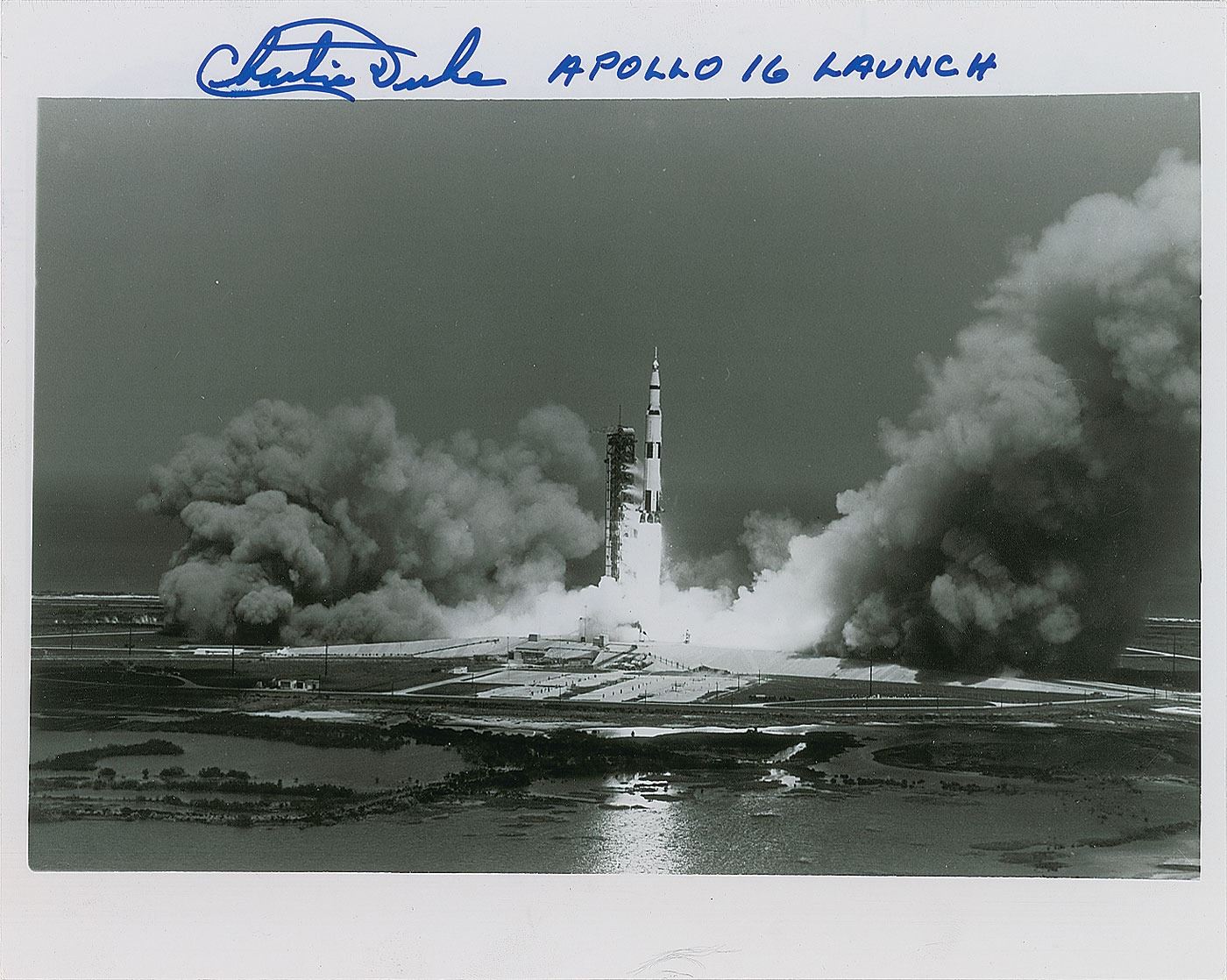 Original official glossy 10 x 8 NASA press photo of the Apollo 16 Saturn V lifting off from Cape Canaveral on April 16, 1972, signed in the upper border in blue felt tip, "Charlie Duke, Apollo 16 Launch." Reverse bears purple NASA caption text. In fine condition, with small creases (mostly to the borders), and several fingerprint impressions.