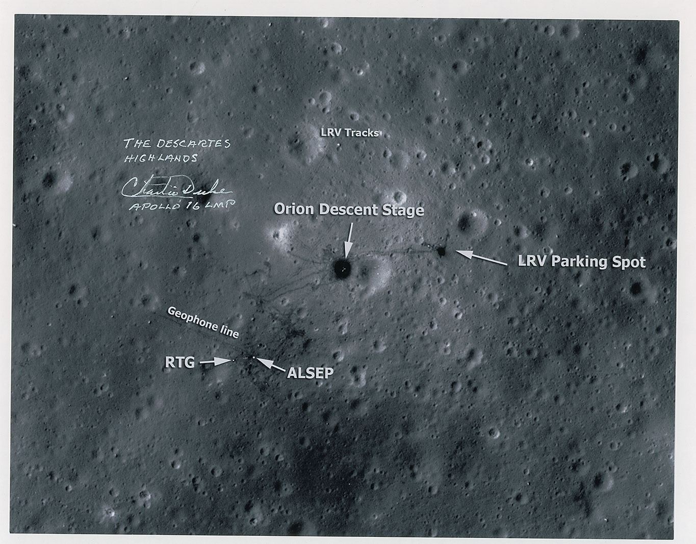 Satin-finish 14 x 11 overhead photo of the lunar landing site of the Apollo 16 mission, with arrows pointing to various mission points of interest, signed in silver ink, "The Descartes Highlands, Charlie Duke, Apollo 16 LMP." In very fine condition. Accompanied by a photo taken at the time of signing.
