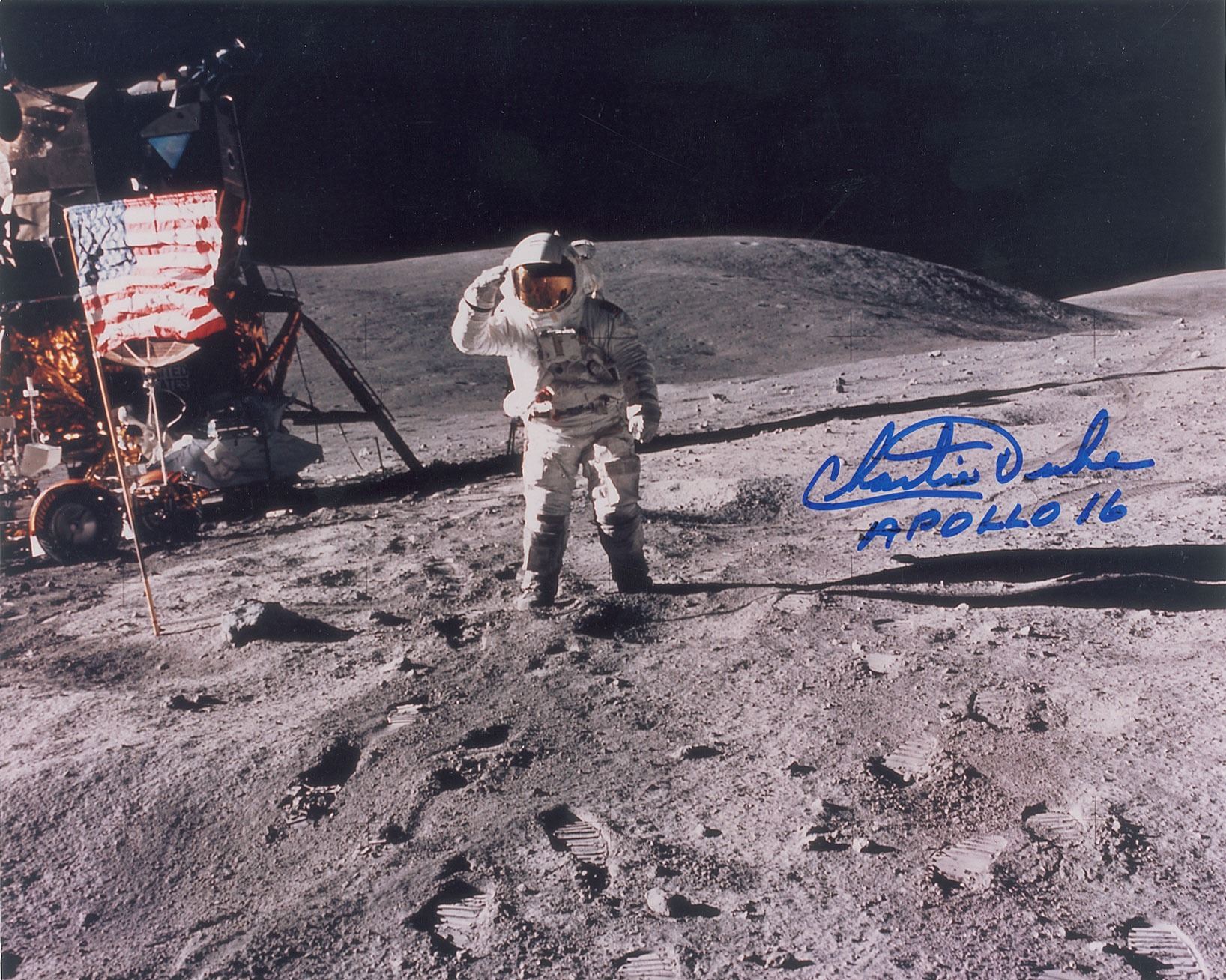 Color satin-finish 10 x 8 photo of LMP Duke saluting the American flag on the lunar surface, signed in blue felt tip, "Charlie Duke, Apollo 16." In fine condition, with a couple of very small surface creases.