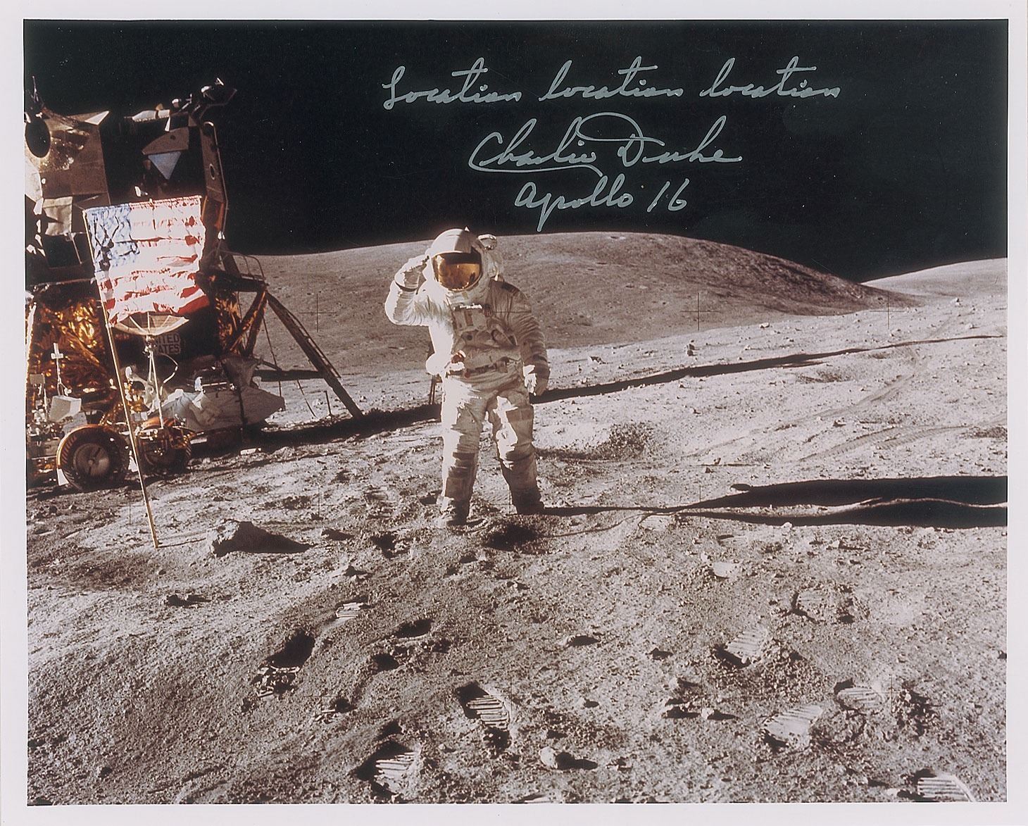 Color semi-glossy 10 x 8 full-length photo of Duke saluting the American flag on the lunar surface during the Apollo 16 mission, signed in silver ink, "Location location location, Charlie Duke, Apollo 16." In very fine condition.