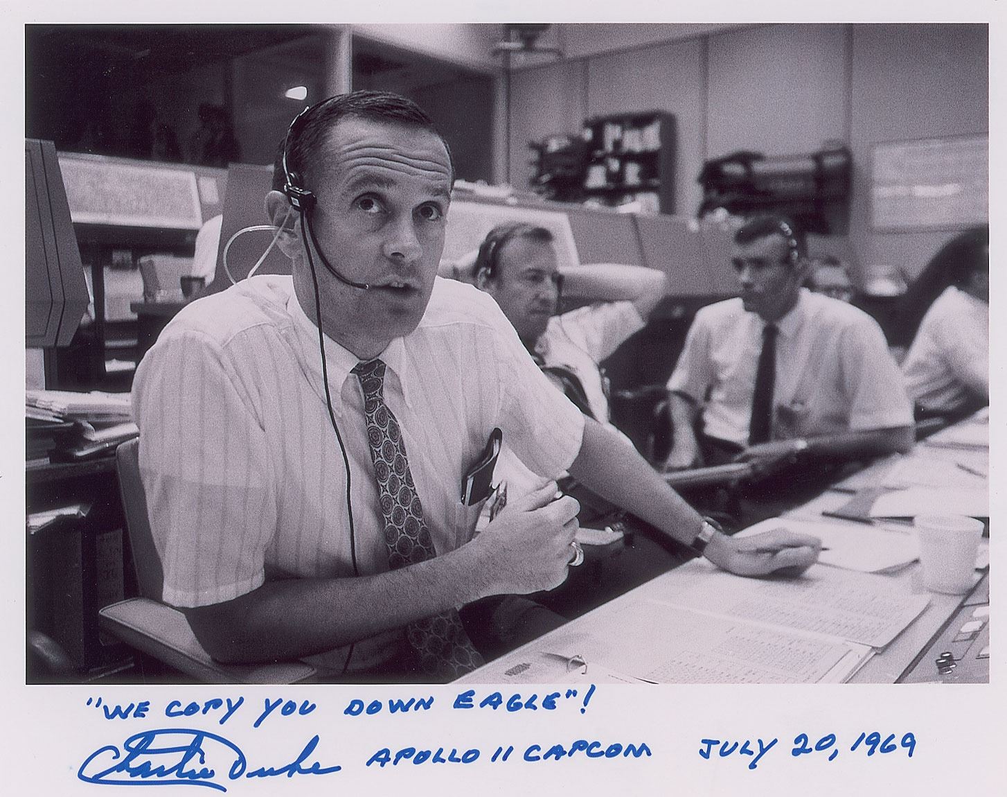 Satin-finish 10 x 8 photo of Duke talking on his headset in the mission control center, with James Lovell and Fred Haise pictured in the background, signed in the lower border in blue felt tip, “‘We copy you down eagle!,’ Charlie Duke, Apollo 11 CAPCOM, July 20, 1969.” In very fine condition.