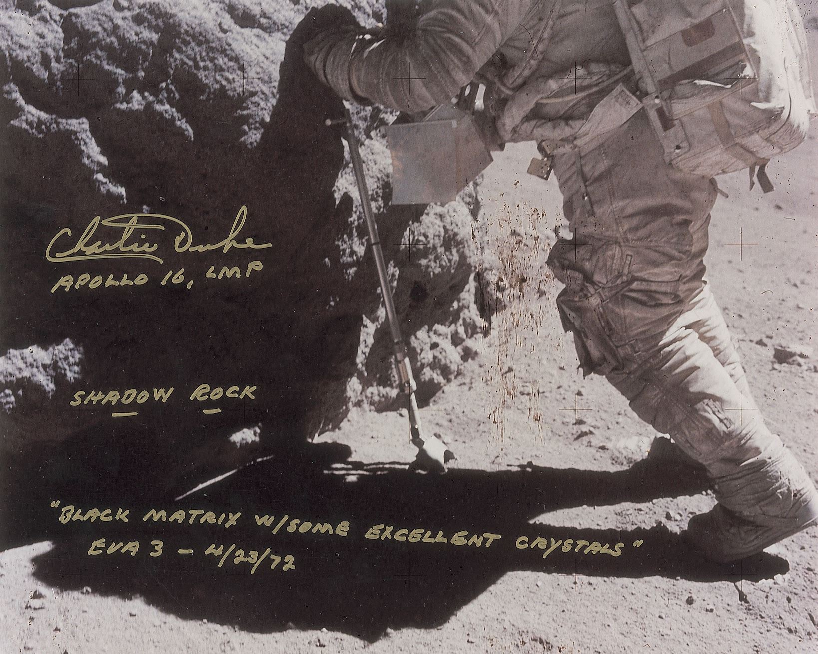Uncommon color glossy 10 x 8 photo of an astronaut taking permanently shadowed soil samples from beneath the 3-meter-high lunar boulder called the 'Shadow Rock,' signed in gold ink, "Charlie Duke, Apollo 16, LMP, Shadow Rock, 'Black matrix w/some excellent crystals,' EVA 3—4/23/72." In very fine condition.