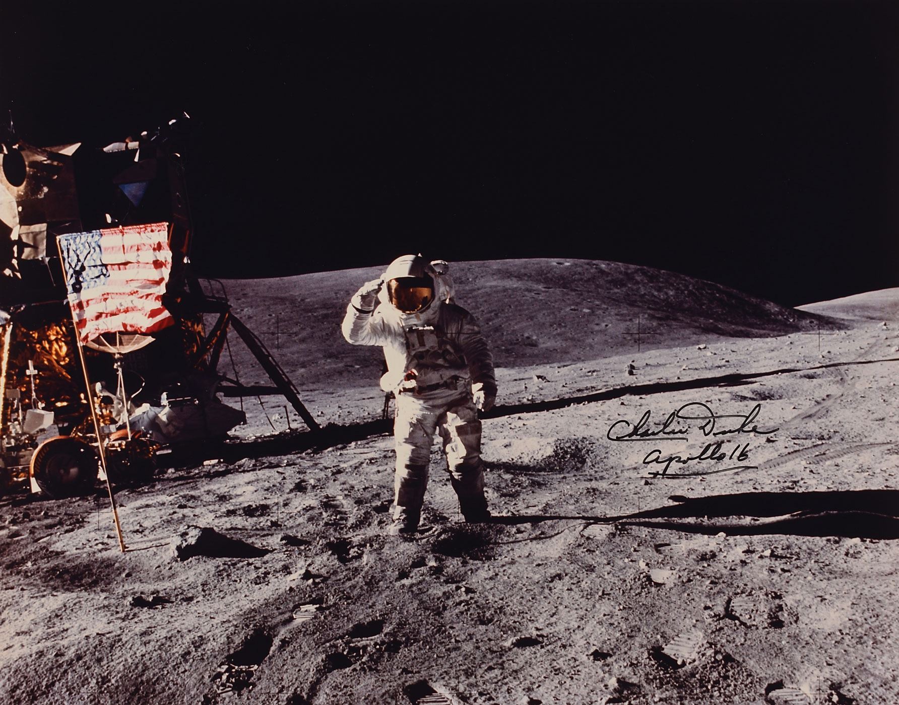 Color semi-glossy 20 x 16 full-length photo of Lunar Module Pilot Duke saluting the American flag during the penultimate moon-landing mission, signed in black felt tip, "Charlie Duke, Apollo 16." In fine condition.