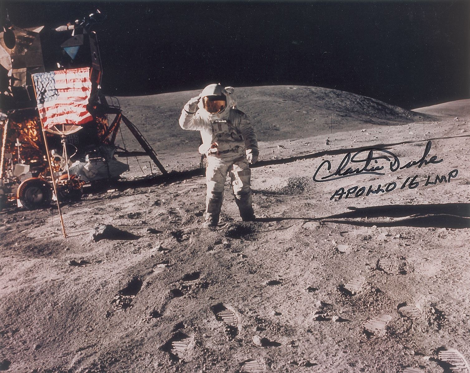 Color satin-finish 10 x 8 photo of Duke saluting the American flag on the lunar surface, signed in black felt tip, "Charlie Duke, Apollo 16 LMP." In fine condition.