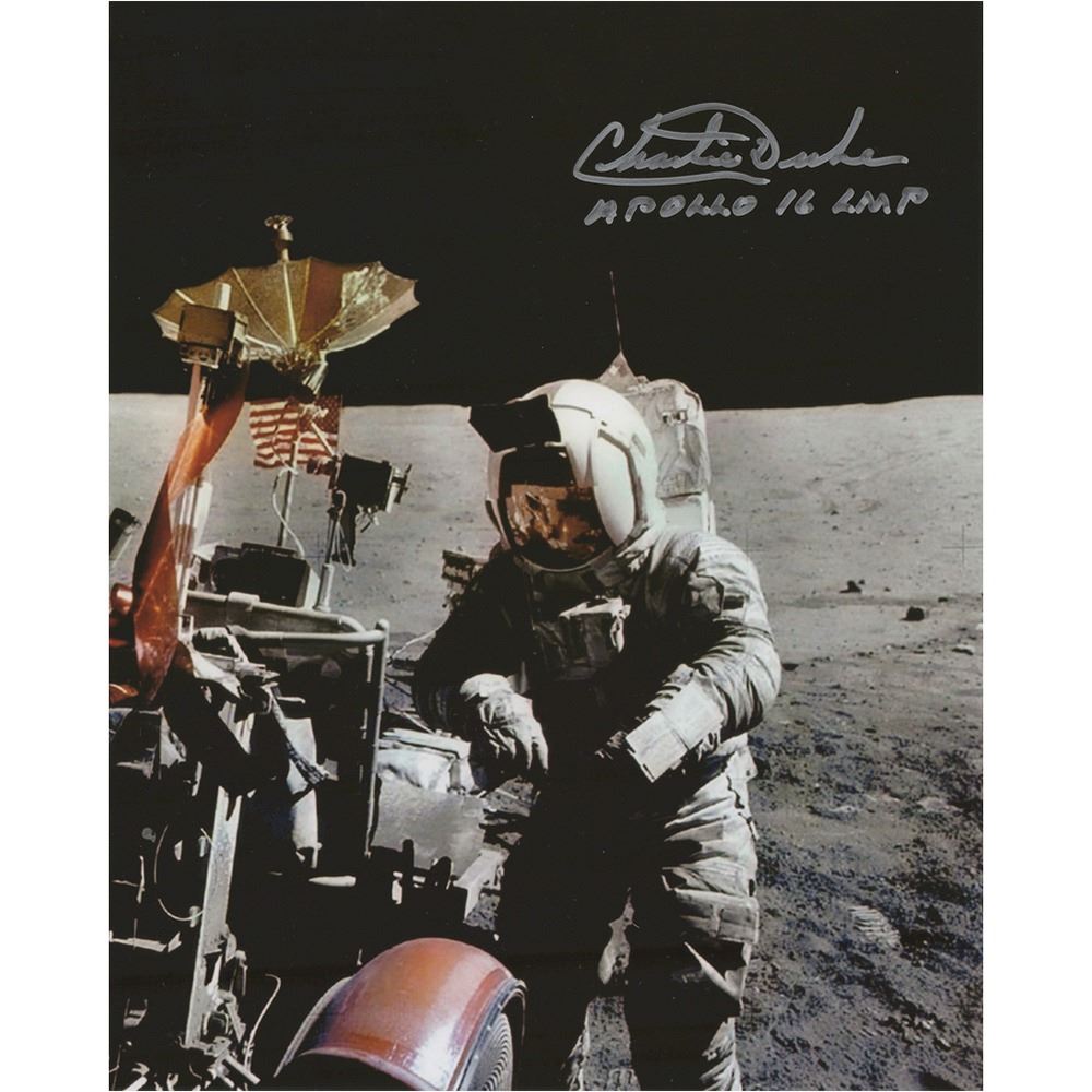 Color satin-finish 8 x 10 photo of LMP Duke working next to the lunar rover during the Apollo 16 mission, signed in silver ink, "Charlie Duke, Apollo 16 LMP." In very fine condition.