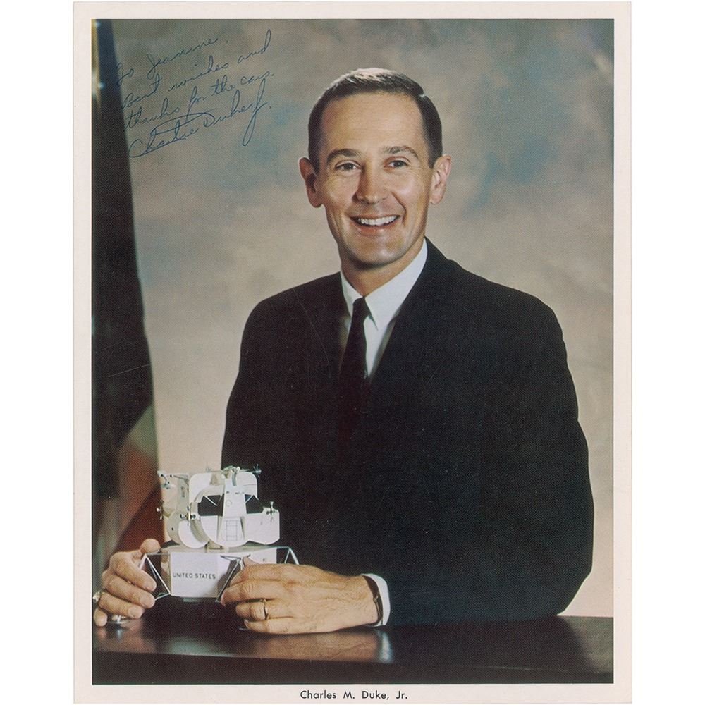 Official color 8 x 10 NASA lithograph of Duke posing with a model of the lunar module, signed and inscribed in blue ballpoint, "To Jeanine, best wishes and thanks for the cars, Charlie Duke, Jr.” In very fine condition. Recipient was an employee at the Los Angeles International Airport who assisted astronauts with picking up their GSA vehicles circa 1967.