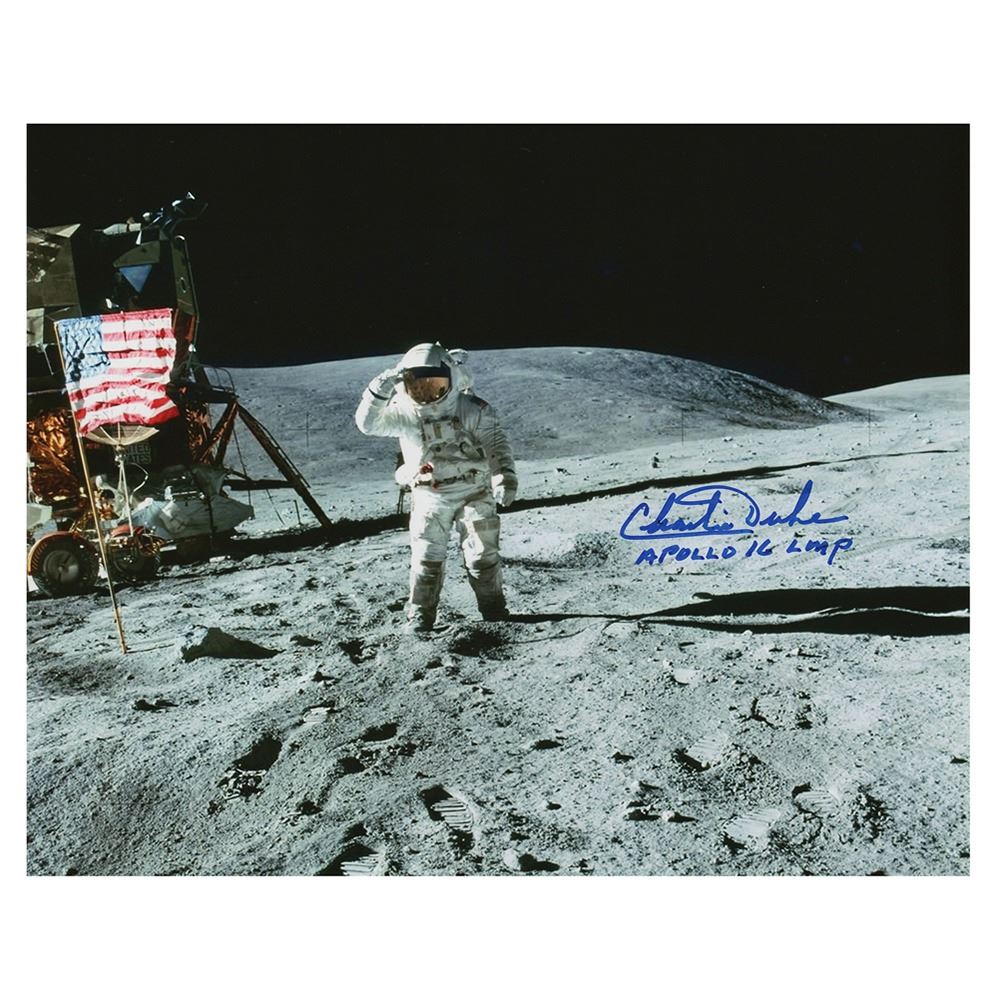 Color glossy 10 x 8 photo of Duke saluting the American flag on the lunar surface, signed in blue felt tip, "Charlie Duke, Apollo 16 LMP." In very fine condition.