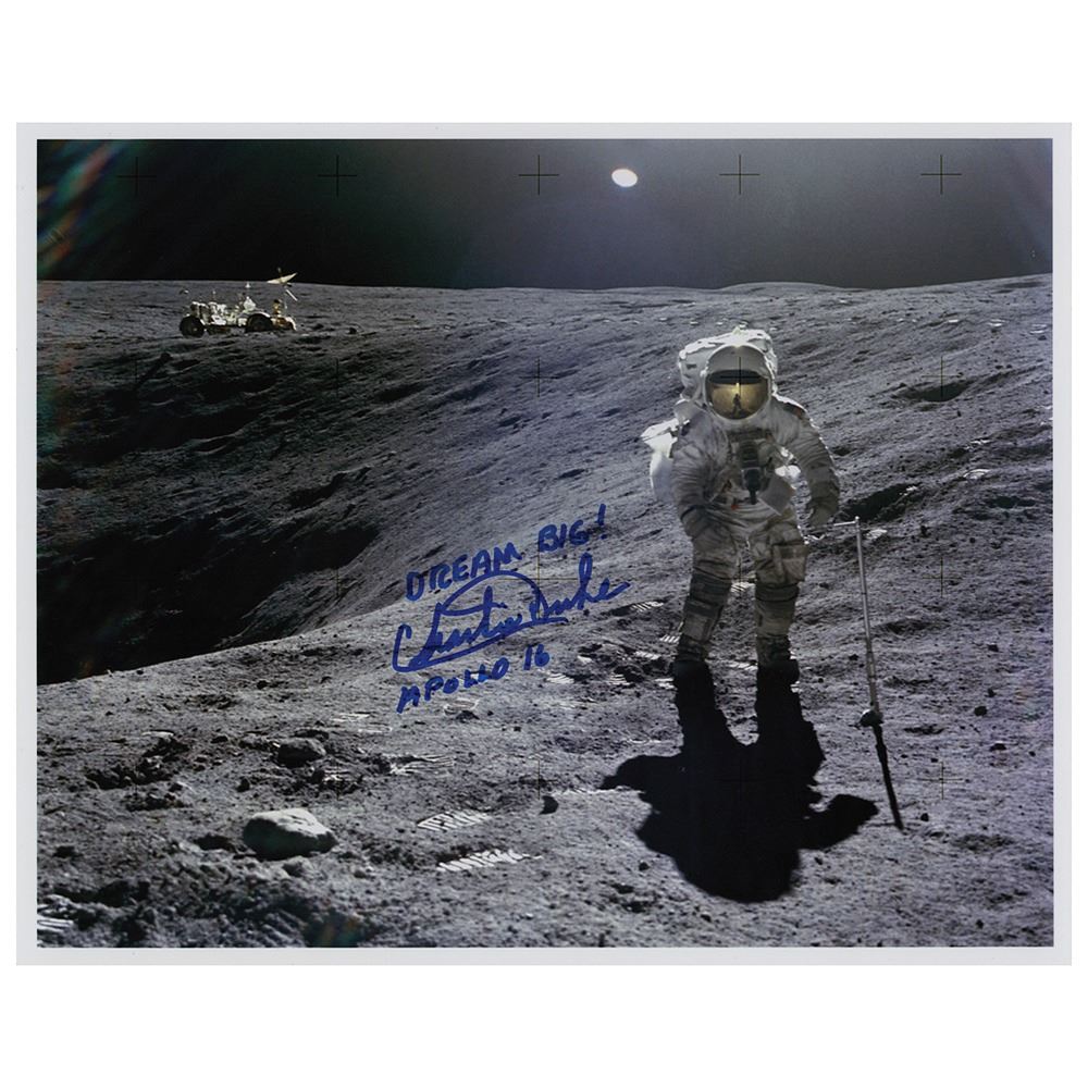Color satin-finish 10 x 8 photo of Duke collecting lunar soil samples at the rim of Plum crater, signed in blue felt tip, "Dream Big! Charlie Duke, Apollo 16." In very fine condition.