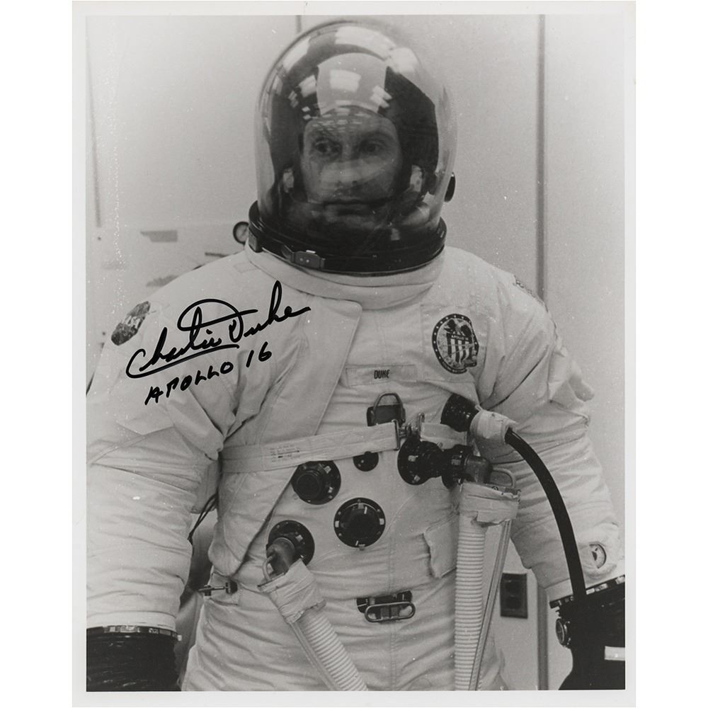 Sharp glossy 8 x 10 photo of Duke during a suit pressure integrity check prior to launch, signed in black felt tip, "Charlie Duke, Apollo 16." In fine condition, with a tiny tear to the top border.