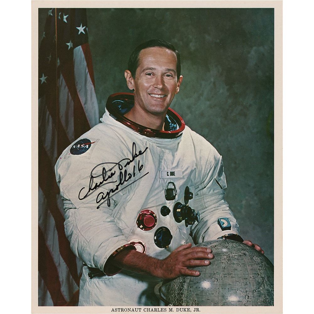 Official color 8 x 10 NASA lithograph of LMP Duke wearing his white space suit and posing with an American flag and lunar globe, signed in black felt tip, "Charlie Duke, Apollo 16." In fine condition.