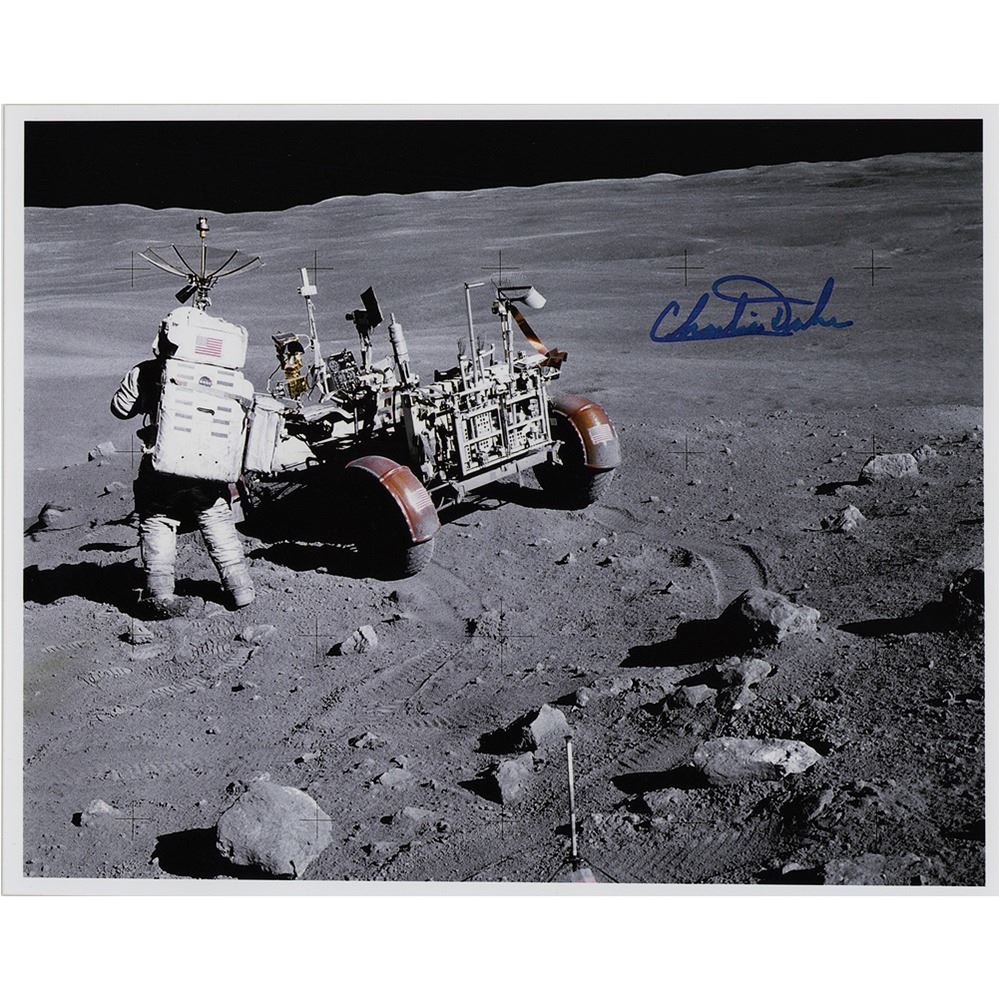 Color satin-finish 10 x 8 photo of LMP Charlie Duke working next to the lunar rover during the Apollo 16 moon mission, signed in blue felt tip. In very fine condition. The photo was taken at Station No. 4, near Stone Mountain, during the second Apollo 16 EVA at the Descartes landing site.