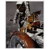Color satin-finish 8 x 10 photo of LMP Charlie Duke standing near the front of the lunar rover during the Apollo 16 moon mission, signed in blue felt tip. In very fine condition.