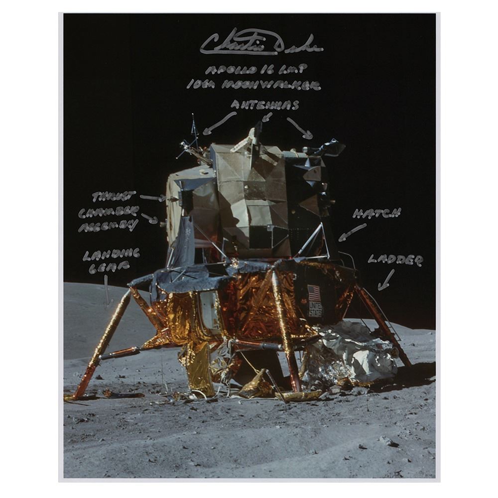 Color satin-finish 8 x 9.75 photo of the Lunar Module on the lunar surface, signed in silver ink, "Charlie Duke, Apollo 16 LMP, 10th Moonwalker," with detailed annotations identifying the spacecraft's "Antennas," "Hatch," "Ladder," "Thrust Chamber Assembly," and "Landing Gear." In very fine condition, with slightly trimmed borders.