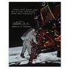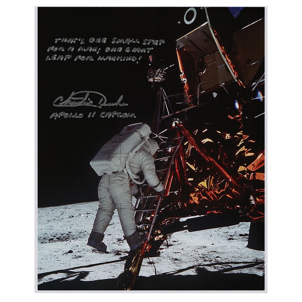 Color satin-finish 8 x 9.75 photo of Buzz Aldrin descending the steps of the LM Eagle's ladder during Apollo 11, signed in silver ink, "That's one small step for a man; one giant leap for mankind! Charlie Duke, Apollo 11 CAPCOM." In very fine condition, with slightly trimmed borders. A superior signed photo evoking Apollo 11 CDR Neil Armstrong's memorable quote upon becoming the first human to set foot on the lunar surface.