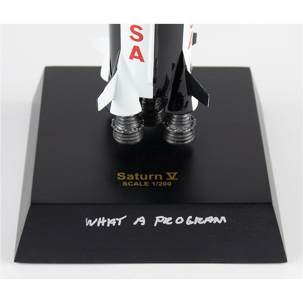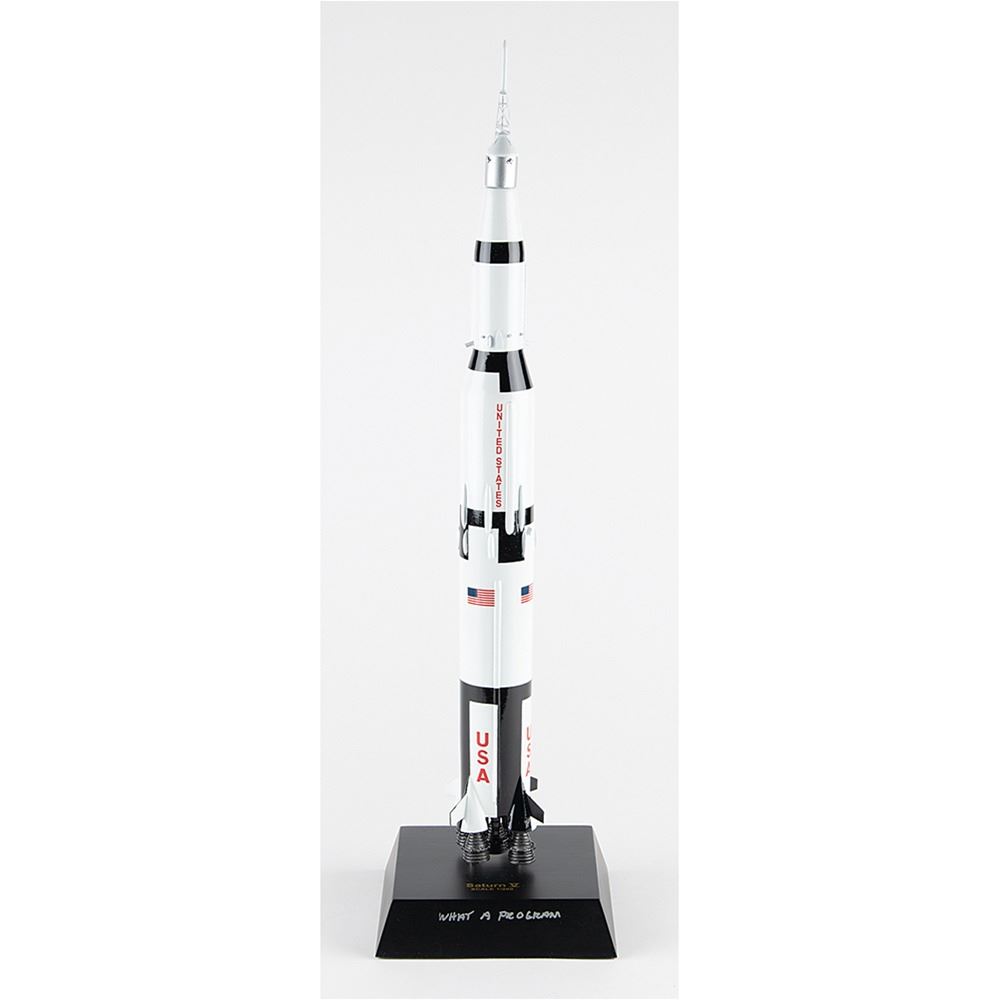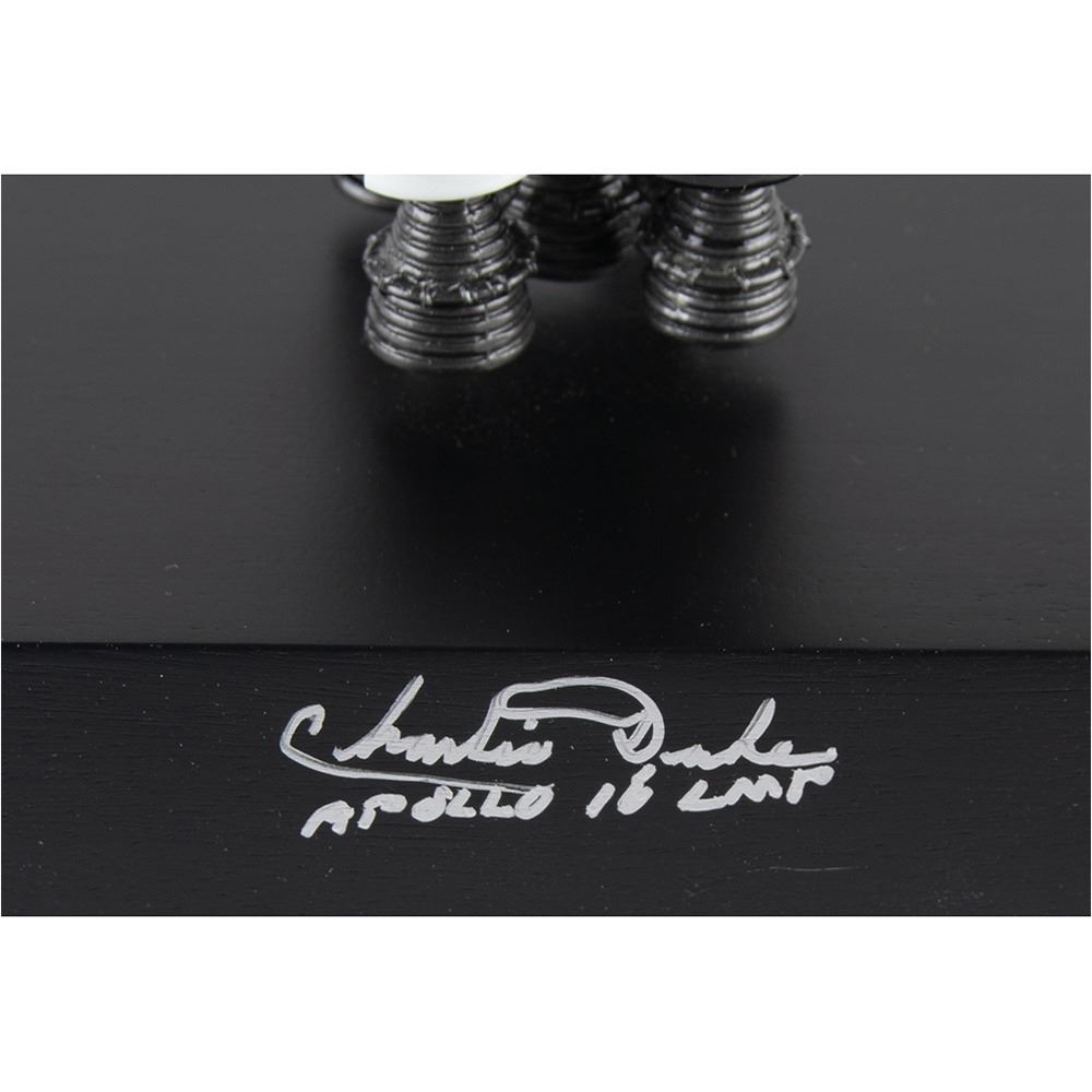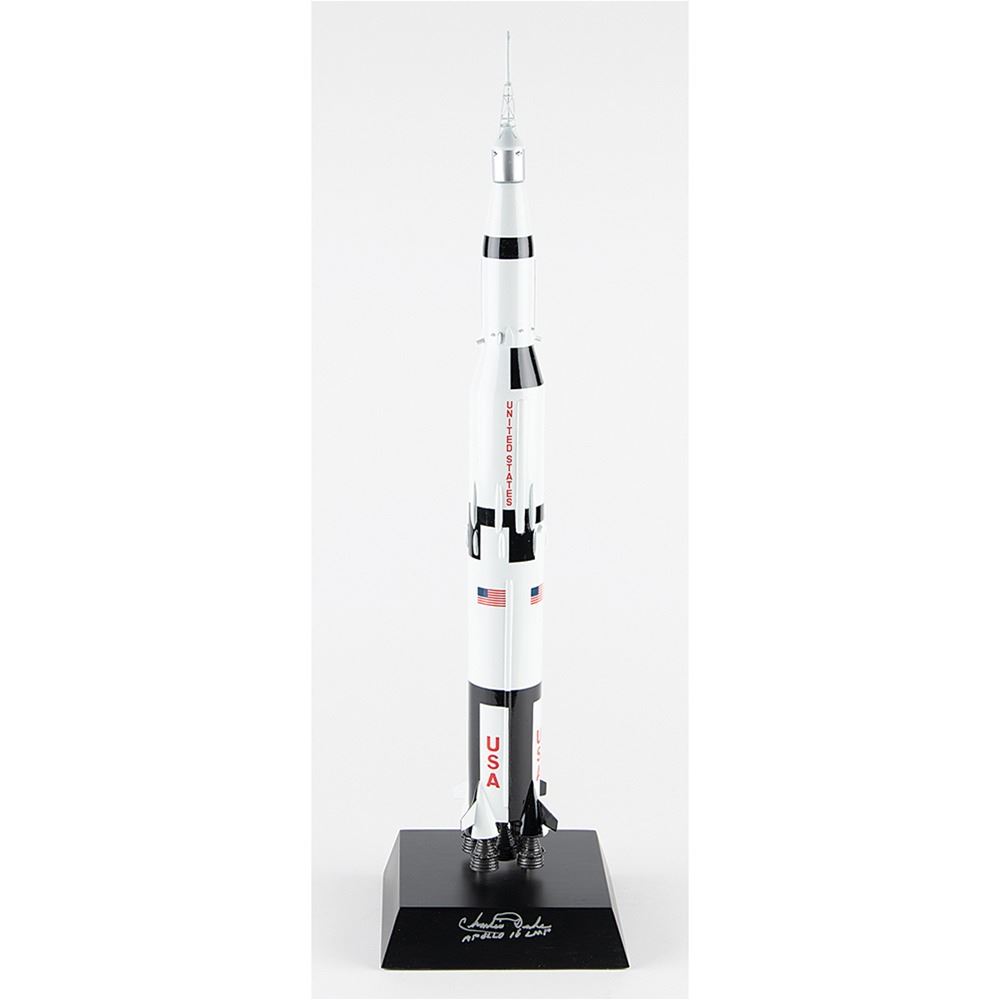 Executive Series 1:200 scale replica model of a Saturn V super heavy-lift launch vehicle by Daron Worldwide Trading. The rocket stands to a height of 24Ë and is set on a black display base, 6.5Ë x 6.5Ë x 1.5Ë, that is signed in silver ink, "Charlie Duke, Apollo 16 LMP." Includes the original shipping box. In fine condition.