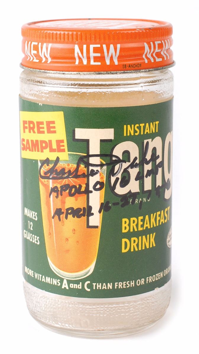 Glass Tang bottle from the late 1960s or early 1970s, measuring 4.75? tall and 2.25? in diameter, signed on the label in black felt tip, “Charlie Duke, Apollo 16 LMP, April 16–27, 1972.” In fine condition, with general expected wear and some light contrast to signature against the label’s dark background. An unusual format reminiscent of the space program.
