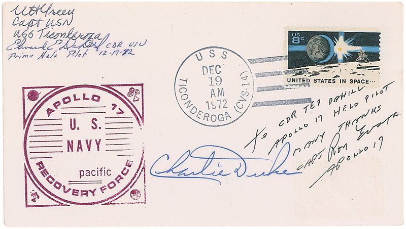 Apollo 17 prime recovery ship commemorative cover, with a cachet honoring the naval recovery force, signed in blue ballpoint by Charlie Duke (who was the Back-up Lunar Module Pilot on Apollo 17), and signed and inscribed in black ballpoint, “To Cdr Ted Dahill, Apollo 17 Helo pilot, Many thanks, Capt. Ron Evans, Apollo 17.” Also signed by two recovery officials. In fine condition.
