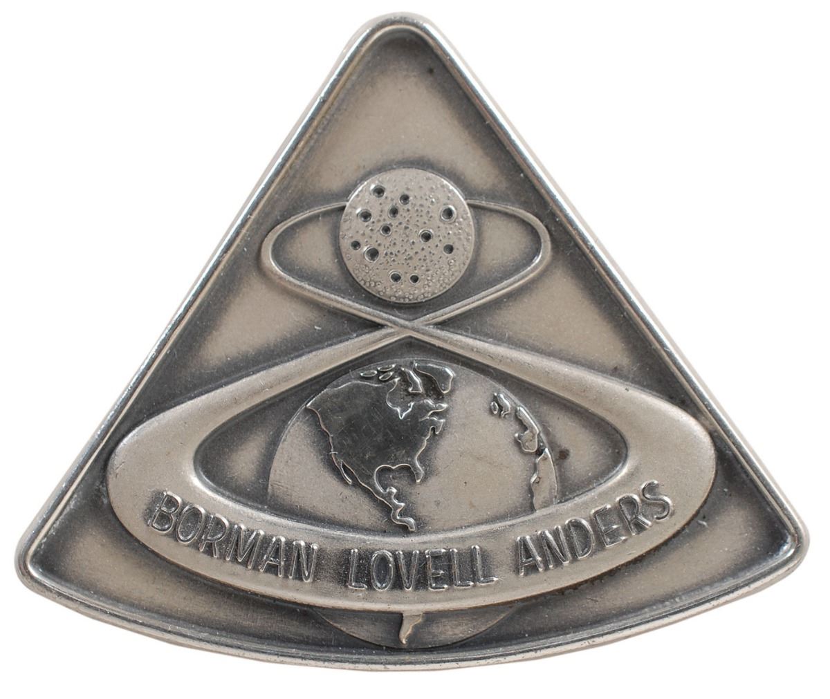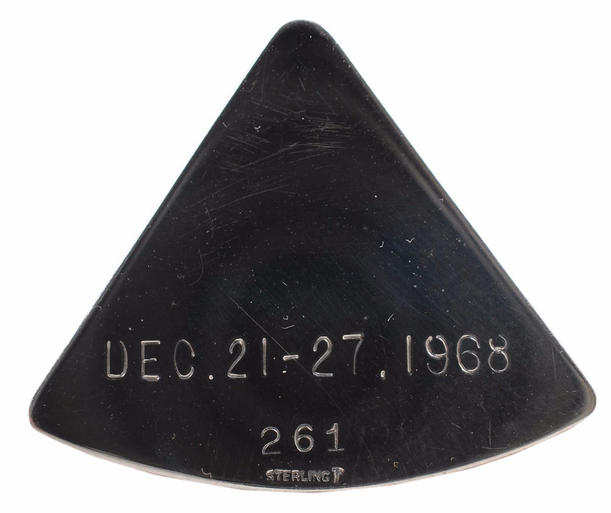 Gorgeous flown sterling silver Apollo 8 Robbins medal with a raised design of the mission insignia on the face, approximately 1.5 x 1.25, engraved with the mission dates on the reverse, “Dec. 21–27, 1968.” The medal is serial numbered “261.” Condition is mint state. Accompanied by a signed letter of provenance from Charlie Duke, certifying that this Robbins medallion is from his personal collection. A magnificent example in spectacular condition.