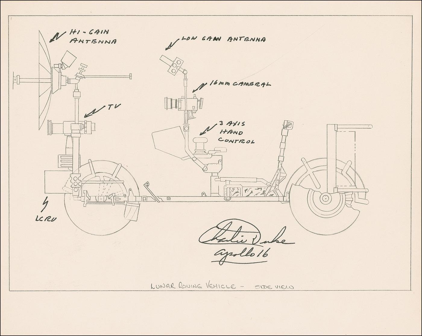 Original signed pencil sketch of a side view of a lunar rover, done in another hand, on an off-white 10 x 8 sheet, signed at the bottom in black ink, “Charlie Duke, Apollo 16,” with Duke labeling six important parts of the rover as well, including the 3-axis hand control, cameras, and both antennas. In very fine condition. A well-done and very detailed sketch politely annotated by the 10th man on the moon.