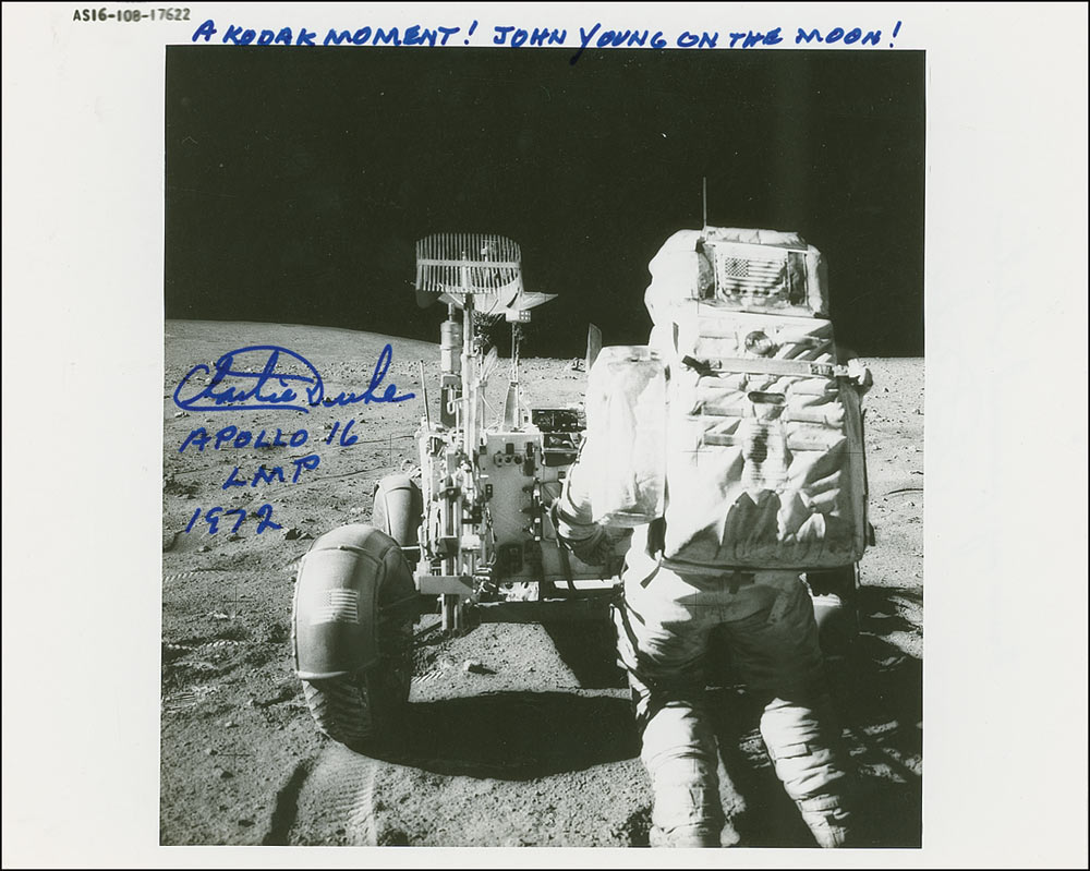 Color satin-finish 10 x 8 photo of John Young by the lunar rover on the surface of the moon, signed in blue felt tip, “A Kodak moment! John Young on the Moon! Charlie Duke, Apollo 16 LMP 1972,” and also signed on the reverse, “From my personal collection, Charlie Duke.” In fine condition, with silvering to darker areas, visible only at an angle, and a few light creases.