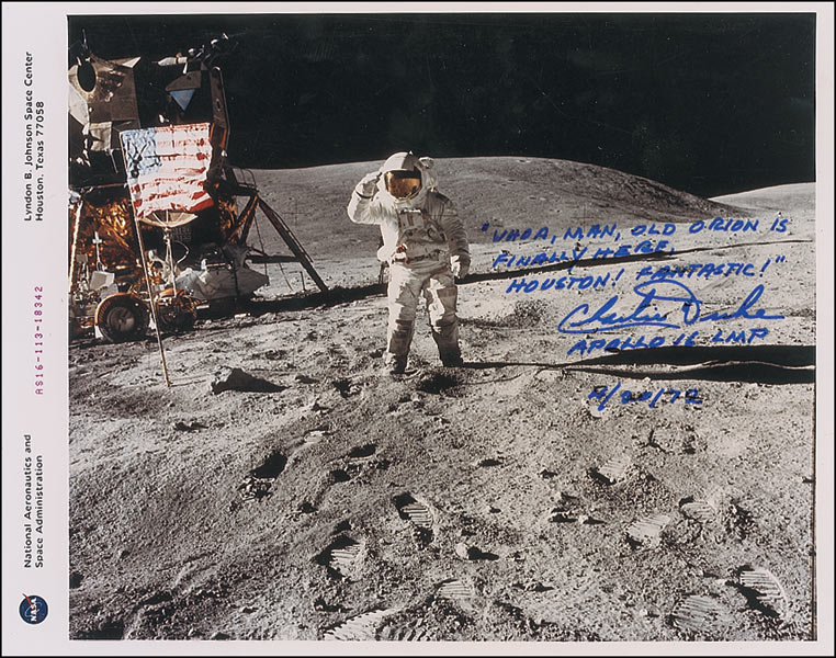 Color glossy 10 x 8 NASA ‘red letter’ photo of Duke on the lunar surface saluting the American flag, signed in blue tip “‘Whoa, man, old Orion is finally here, Houston! Fantastic!’ Charlie Duke, Apollo 16 LMP 4/20/72.” In fine condition.