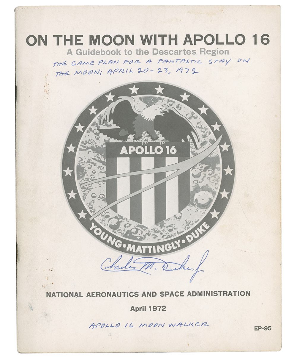 On The Moon With Apollo 16, A Guidebook to the Descartes Region guidebook, 8 x 10.25, 90 pages, printed by NASA in 1972. Guidebook provides an in-depth description, images, and diagrams concerning the upcoming Apollo mission and the crews training. Signed on the front cover in blue ballpoint, “The game plan for a fantastic stay on the Moon; April 20–23, 1972, Charles M. Duke, Jr., Apollo 16 Moon Walker.” In fine condition, with mild handling wear, and scattered toning, soiling, and creasing to covers. Accompanied by a photo of Duke holding the guidebook after signing.